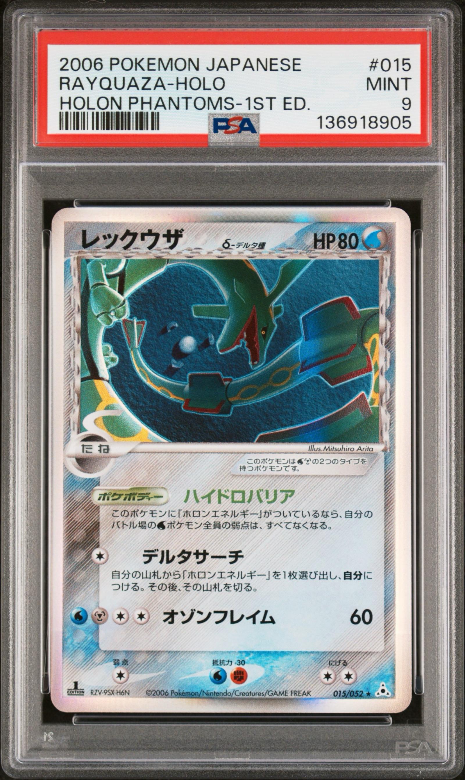 2006 Japanese Rayquaza holographic card from the Holon Phantoms set, 1st Edition. Card #15/052 featuring artwork by Mitsuhiro Arita. PSA graded Mint 9. The card is foil and a desirable collectible, also playable in certain formats. Card code: RZY-9SX-H6N.