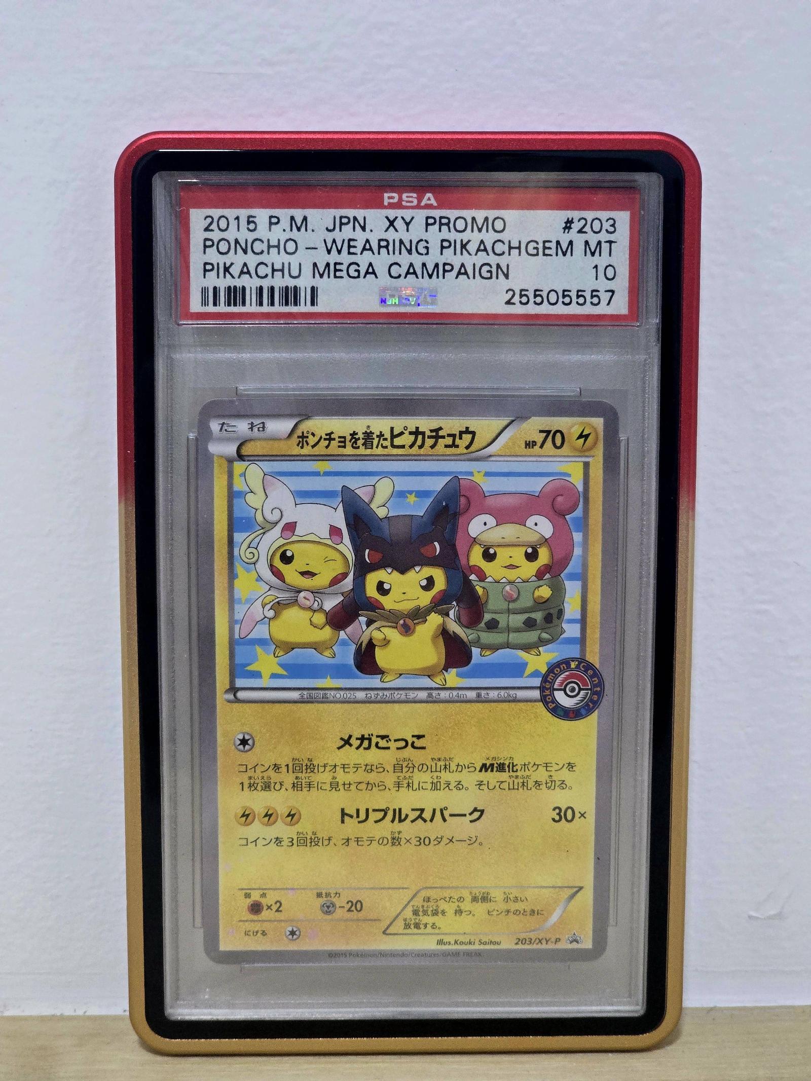 Graded PSA 10 Gem Mint 2015 Japanese XY Promo Pikachu wearing Poncho #203. Part of the Pikachu Mega Campaign. Card code 203/XY-P. Illustrated by Kouki Saitou. This card is a highly collectible promo card and is not typically played in the competitive meta.