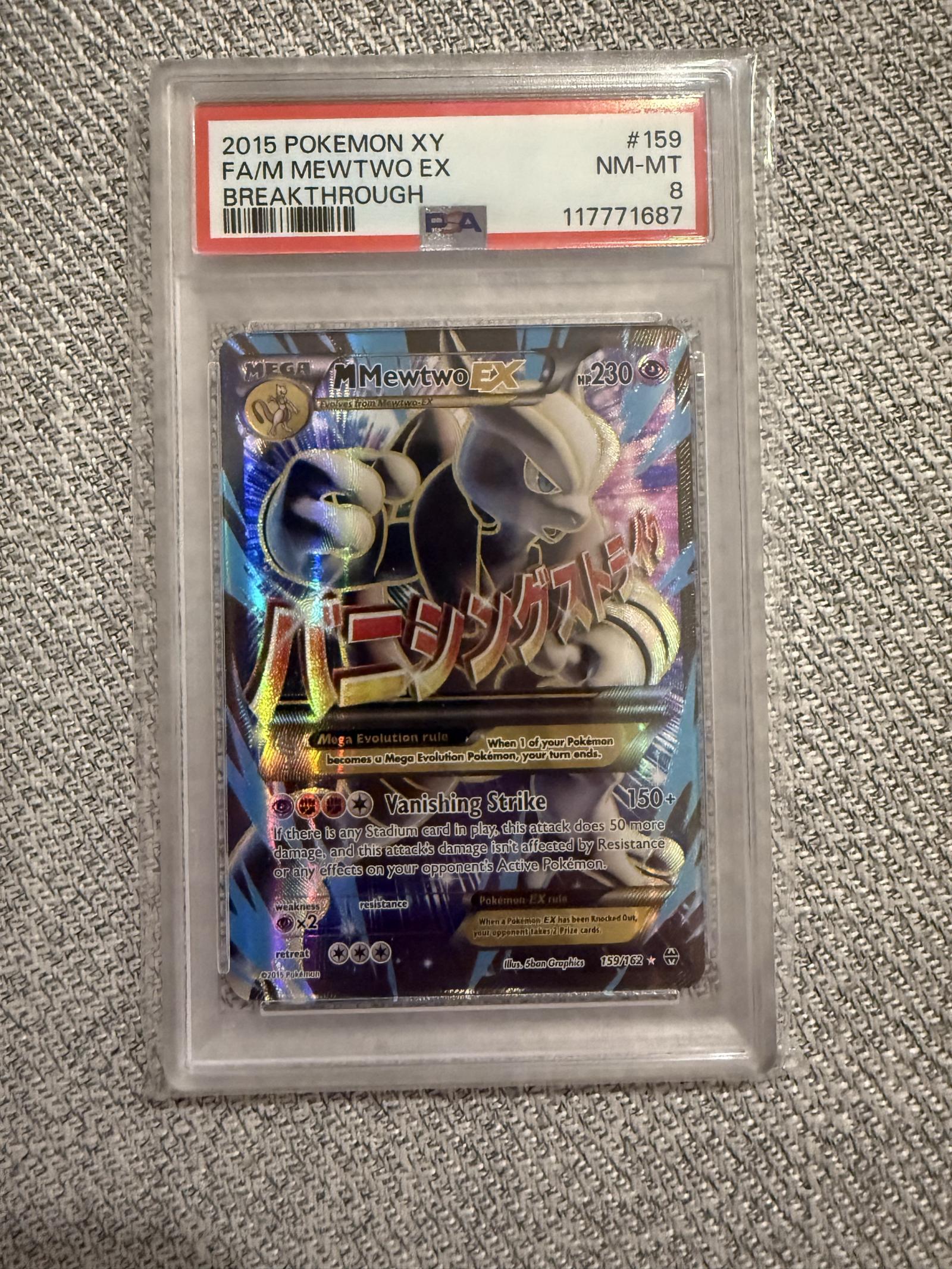 2015 Pokemon XY Breakthrough Mega M Mewtwo EX (#159/162) graded PSA 8 Near Mint-Mint. Full Art card illustrated by 5ban Graphics. This card is foil and collectible, also playable in competitive Pokemon TCG meta. Card code 117771687.