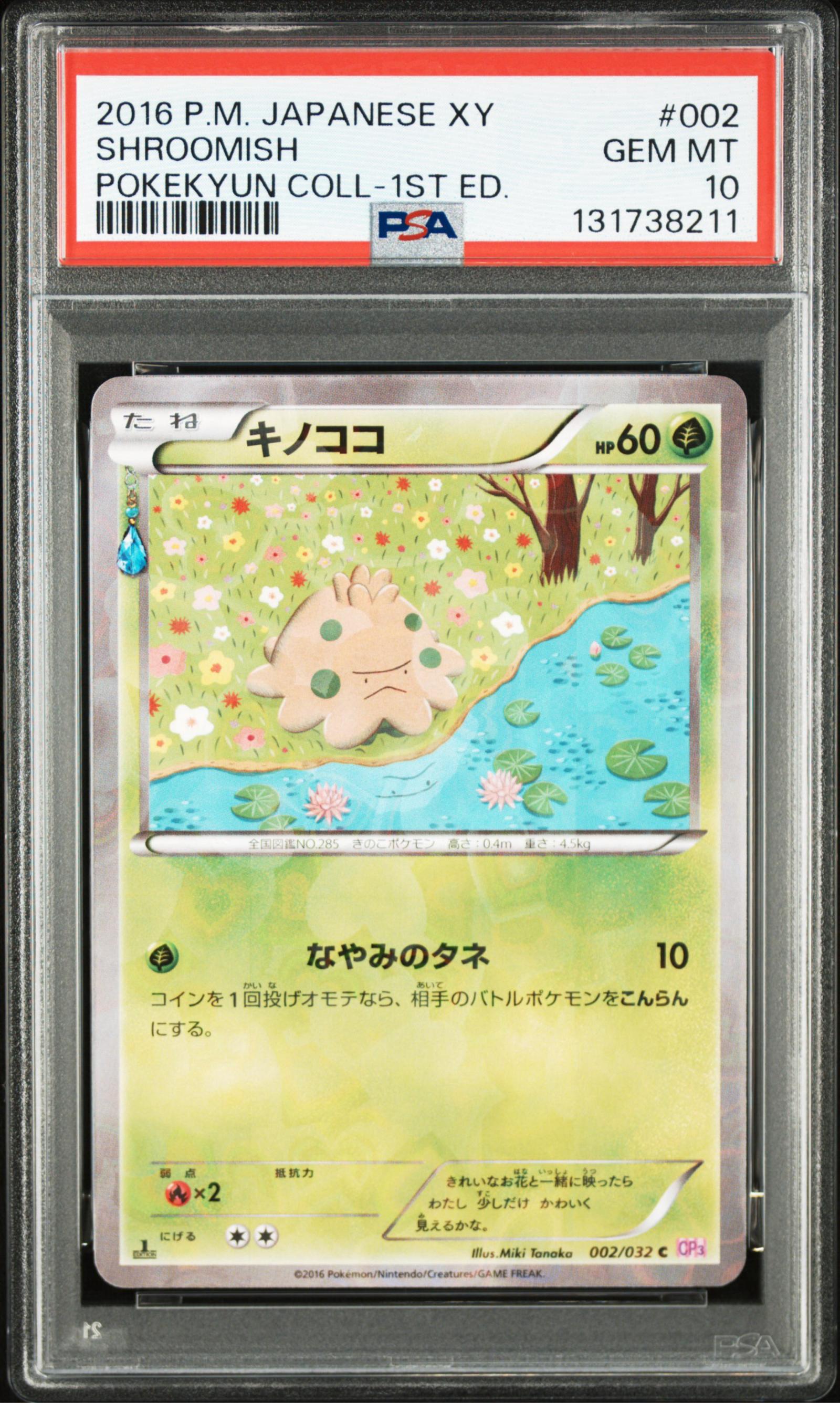 This is a 2016 Japanese Pokémon XY set Shroomish card, 1st Edition, graded PSA 10 Gem Mint. Card number 002/032, illustrator Miki Tanaka. The card is from the Pokekyun Collection and features grass type Pokémon with 60 HP. This is a collectible item, slabbed and graded for authentication and condition preservation. Card code: 131738211. The card is foil and highly sought after by collectors.