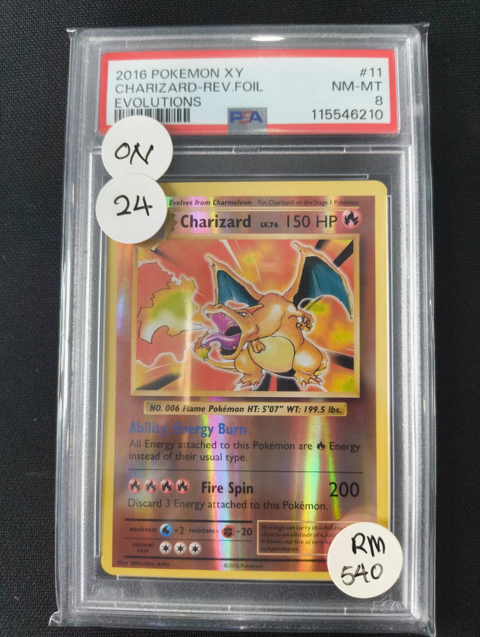 2016 Pokemon XY Evolutions Charizard Reverse Foil card, graded PSA NM-MT 8. Card number 11, featuring artwork by Mitsuhiro Arita. This card is a collectible reverse holo foil from the Evolutions set, playable but mostly sought for its rarity and iconic status. PSA certification number 115546210.