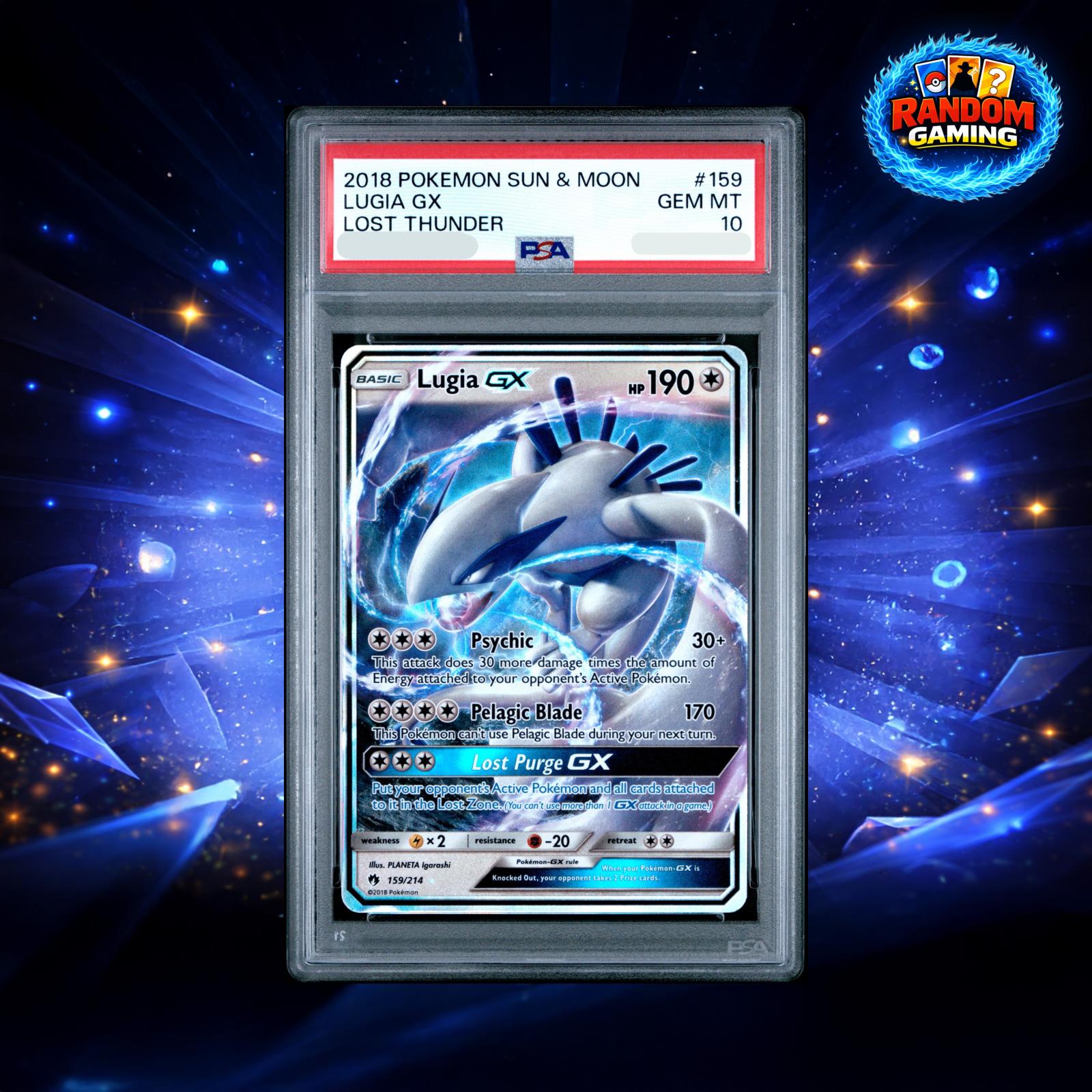 Graded PSA 10 Gem Mint Lugia GX from the 2018 Pokemon Sun & Moon Lost Thunder set. Card #159/214, illustrated by PLANETA Igarashi. This holofoil GX card features powerful attacks like Pelagic Blade and Lost Purge GX. Playable in competitive meta and highly collectible, especially in this pristine graded condition.