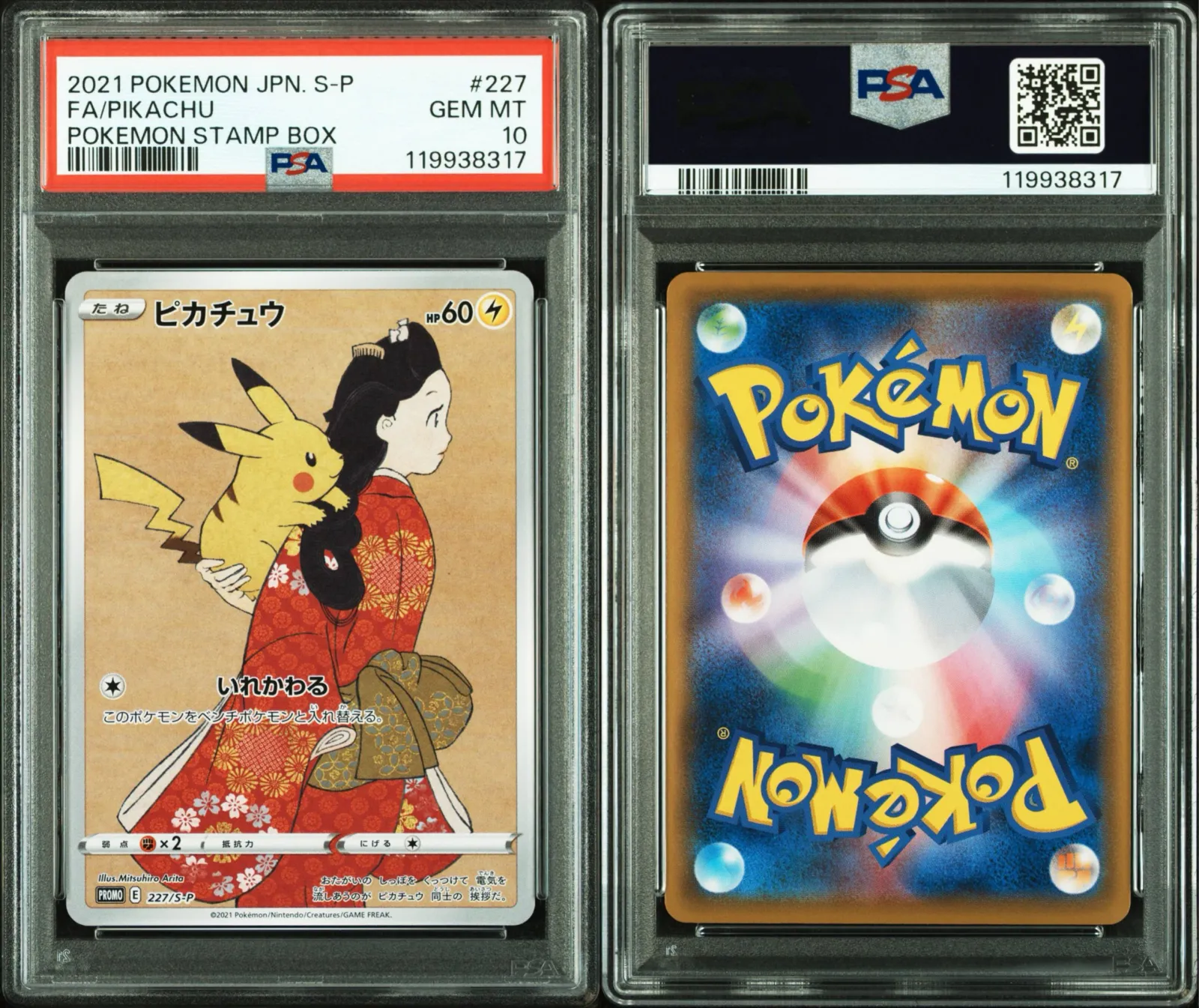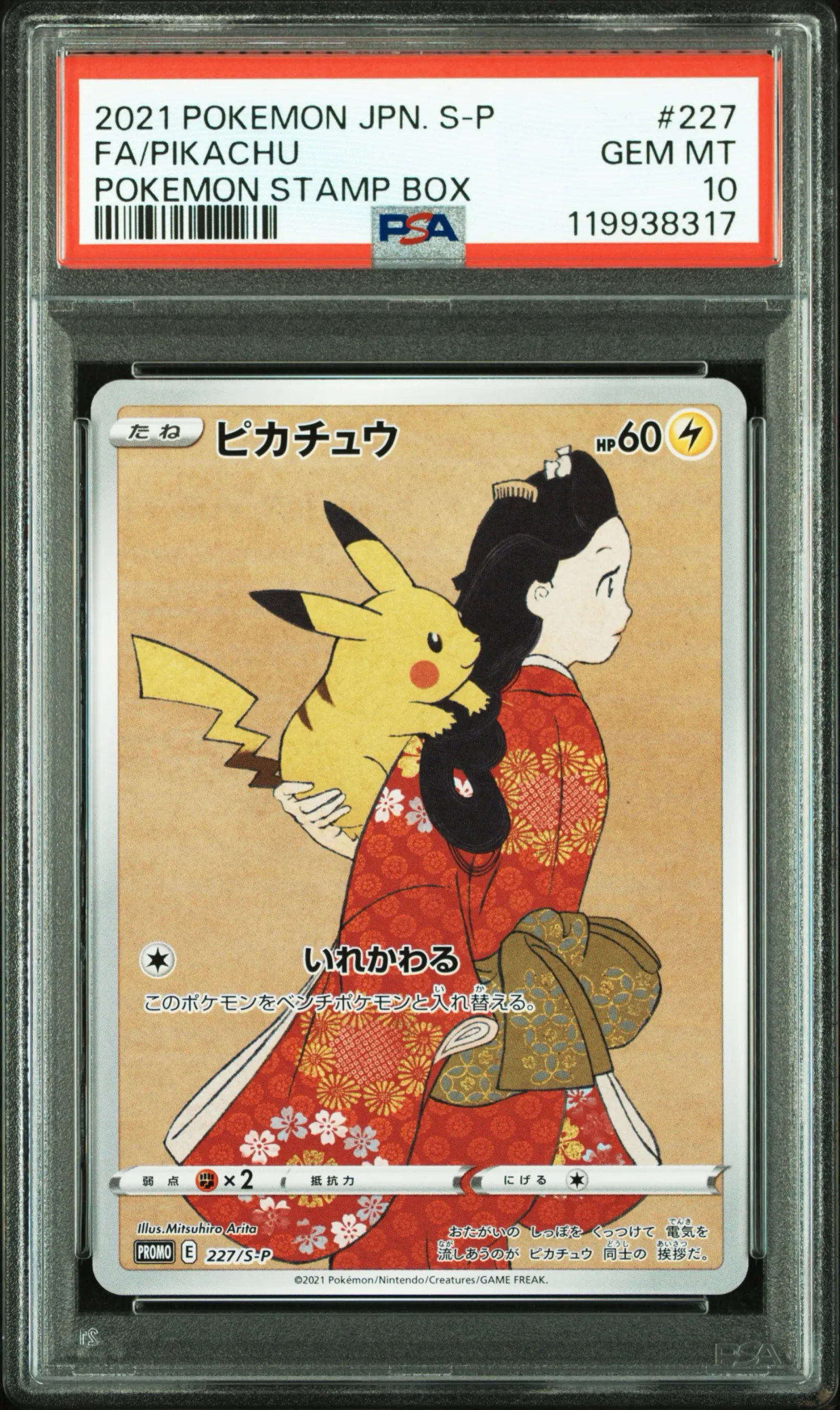 This is a 2021 Japanese Promo Pikachu card from the Pokemon Stamp Box set, card number 227/S-P. Graded PSA GEM MT 10 by PSA, It is known as the "Beauty Looking Back" Pikachu, illustrated by Mitsuhiro Arita, and was available only via a lottery system in Japan. The card is a promotional (PROMO) printing and is not foil. This collectible card stands out for its unique artwork and high grade, making it a valuable piece for collectors rather than a competitive meta-playable card.
