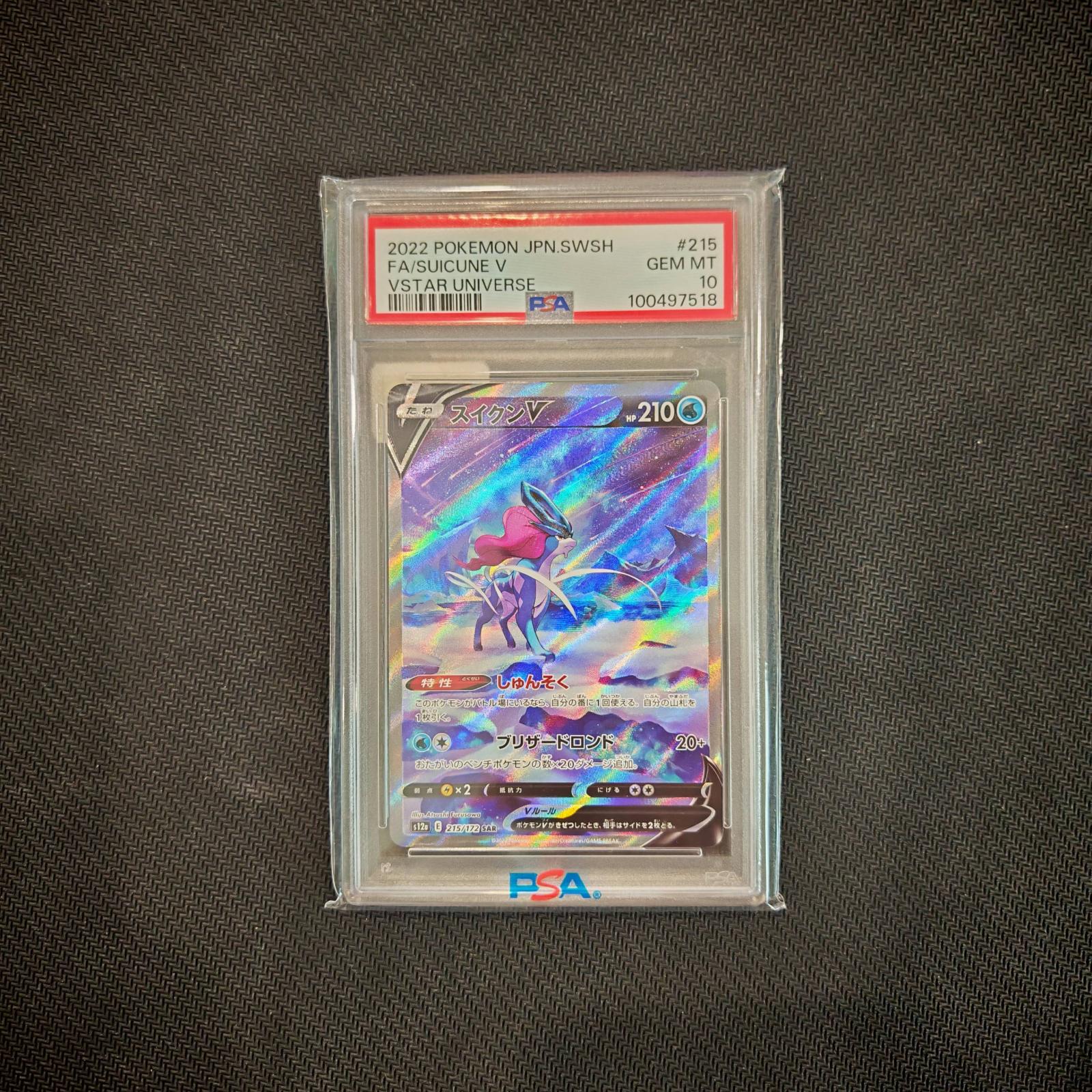 This is a 2022 Pokémon Japanese Suicune V Full Art card from the VSTAR Universe set, card number 215. It has been graded a Gem Mint 10 by PSA, indicating it is in pristine condition.It is a highly collectible card due to its full art and high grade. The card is playable in VSTAR competitive formats as a Water-type V Pokémon.