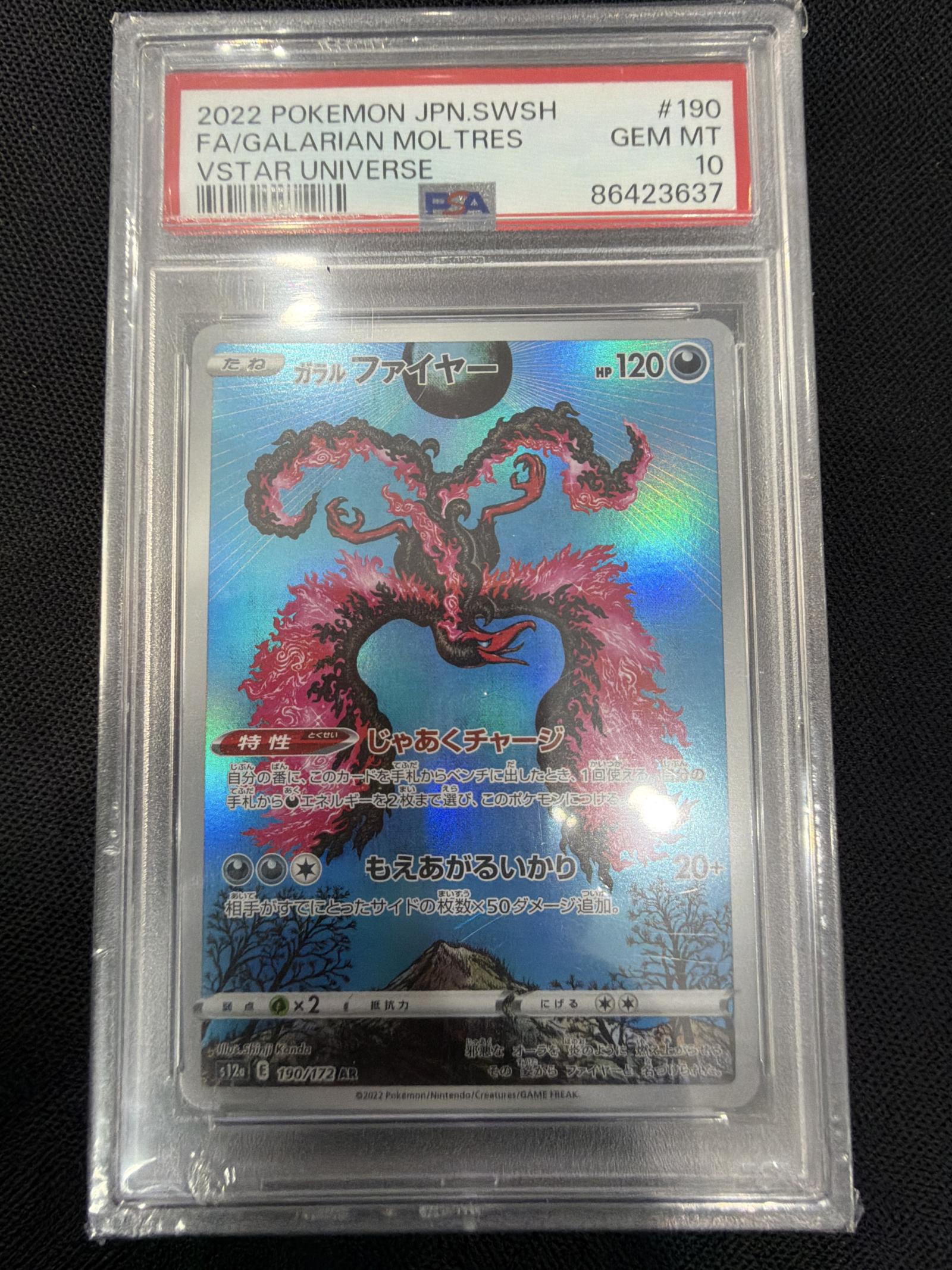 2022 Japanese Pokemon Sword & Shield VSTAR Universe set Galarian Moltres Full Art card, card number 190/172, artist 5ban Graphics. This foil card is graded PSA GEM MT 10. Playable in meta and highly collectible due to perfect grading and full art design.