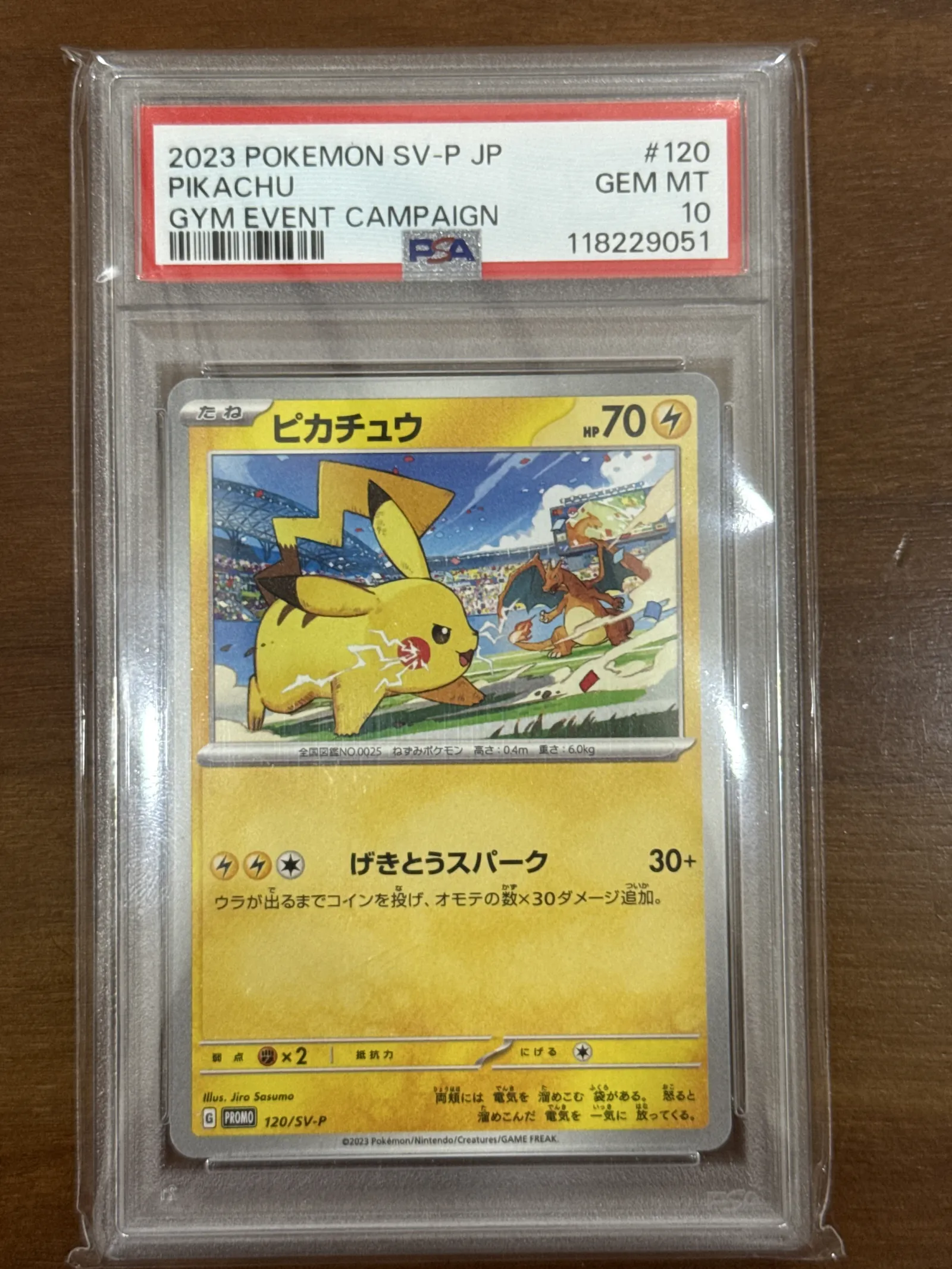 Pikachu promo card from the 2023 SV-P Japanese Gym Event Campaign set. Card number 120. Artist: Jiro Suzuno. Graded PSA GEM MT 10. This is a collectible promo card featuring Pikachu with artwork by Jiro Suzuno.