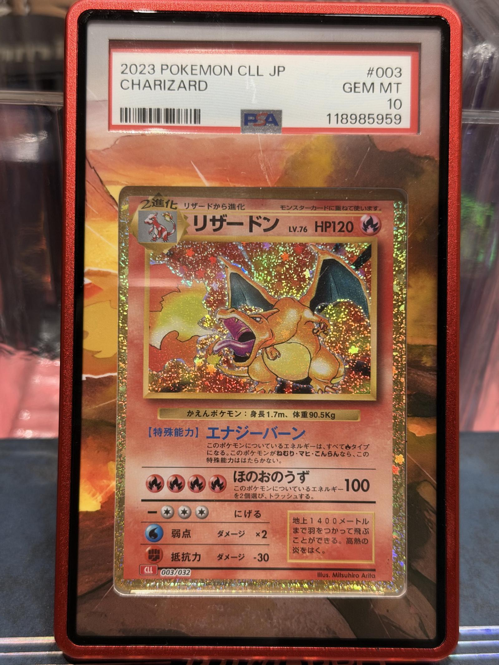 2023 Pokémon CLL Japanese Charizard card (#003/032) graded PSA 10 Gem Mint. Card features holographic foil with artwork by Mitsuhiro Arita. This collectible card is a part of the Pokémon Center League (CLL) set and is a prized item for collectors. Language: Japanese. Foil holo and graded for condition.