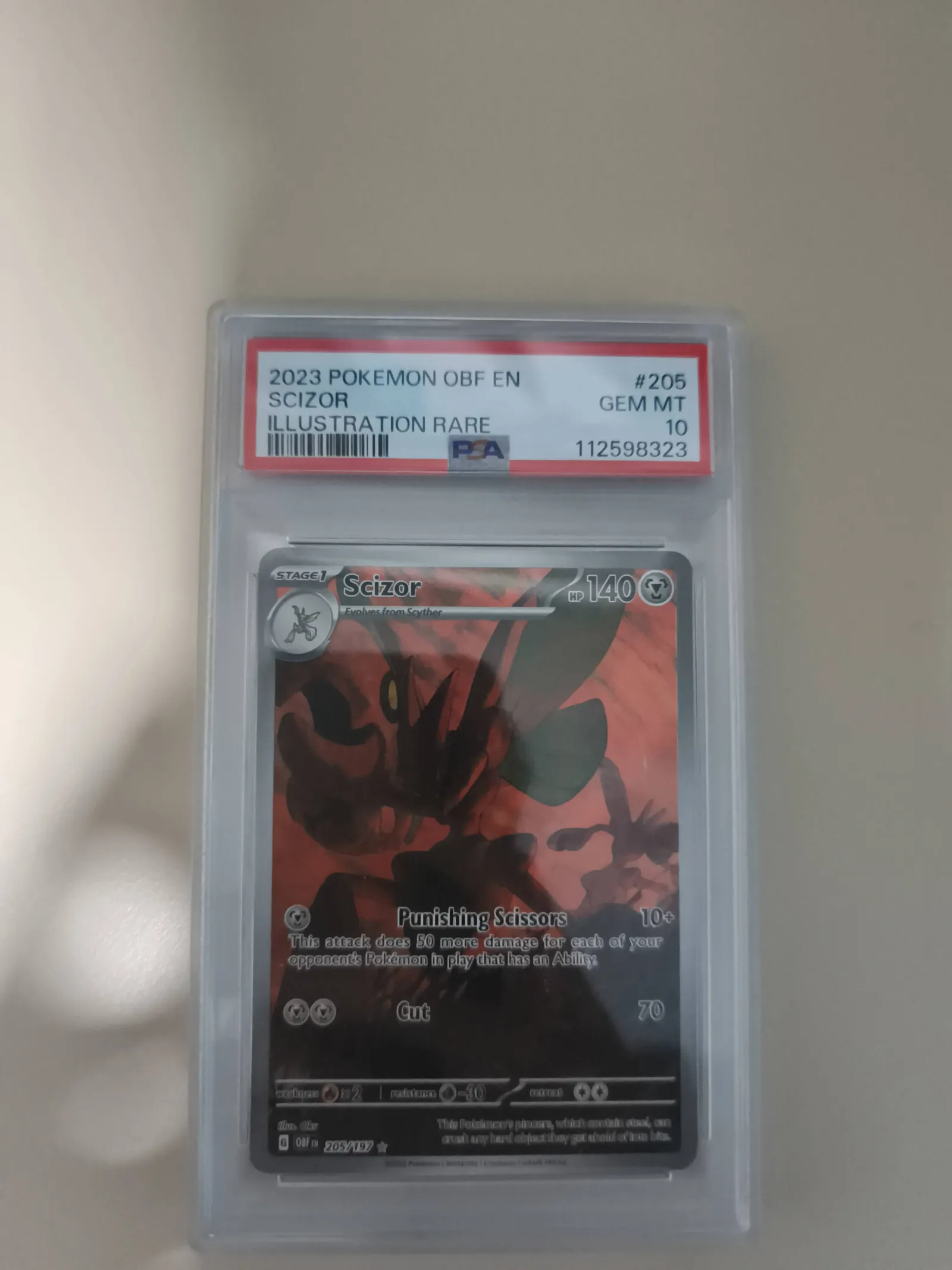 This is a 2023 Pokemon OBF set Scizor Illustration Rare card, numbered 205/197. It has been professionally graded by PSA as GEM MT 10. The card features artwork by 5ban Graphics and is printed in English. It is a collectible foil card, popular for display or investment rather than competitive play.