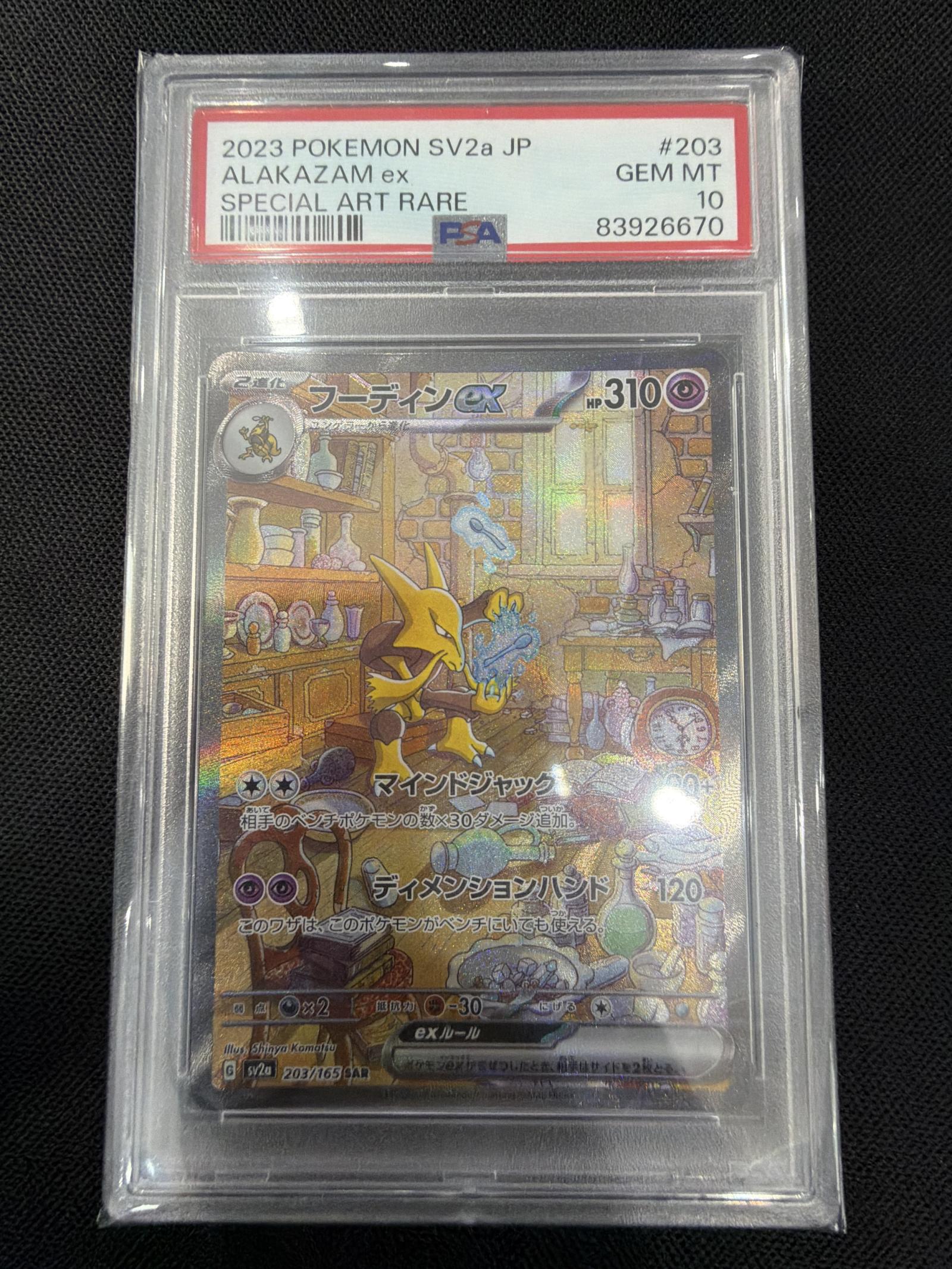 Graded PSA GEM MT 10. Japanese Alakazam ex card from the 2023 SV2a set, card number 203/165 SAR. Special Art Rare holo with artwork by Shinya Komatsu. A collectible card not typically used in the competitive meta. The card features a full-art style with holographic foil treatment.