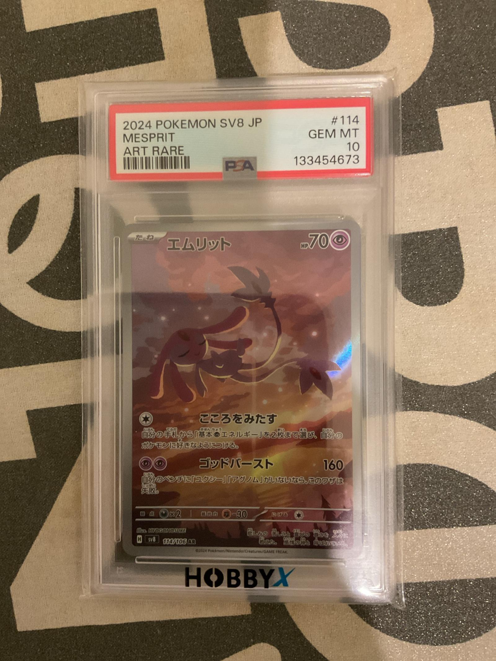 Graded PSA 10 GEM MT Mesprit Art Rare card from the 2024 Pokemon SV8 set. Japanese language edition, card number 114/106. This card features beautiful artwork and is highly collectible. It is a special art rare foil card with high-grade condition, suitable for collectors and fans of the Pokemon TCG.