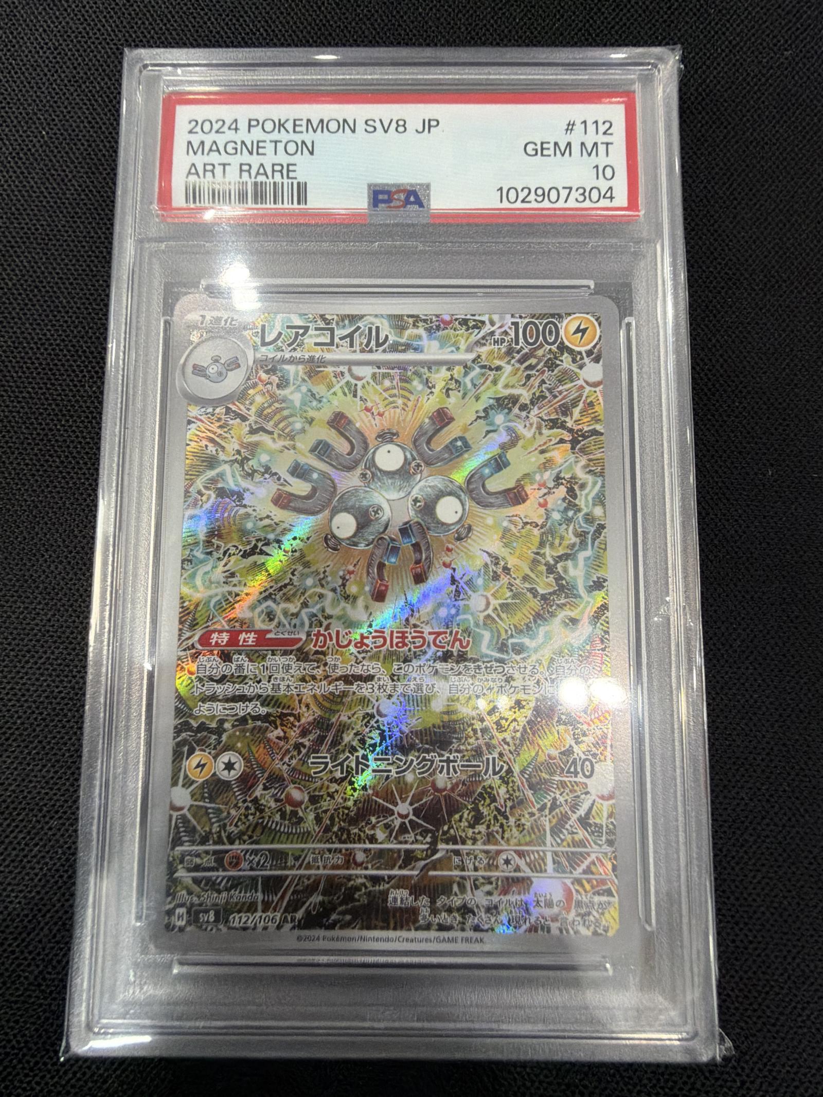 Magneton Art Rare card from the 2024 Pokémon SV8 set. Card number 112/106. Japanese language. Graded Gem Mint 10 by PSA. Features artwork by Kanda. This foil card is collectible and has an art rare printing treatment. The card is playable but primarily valued for its rarity and condition.