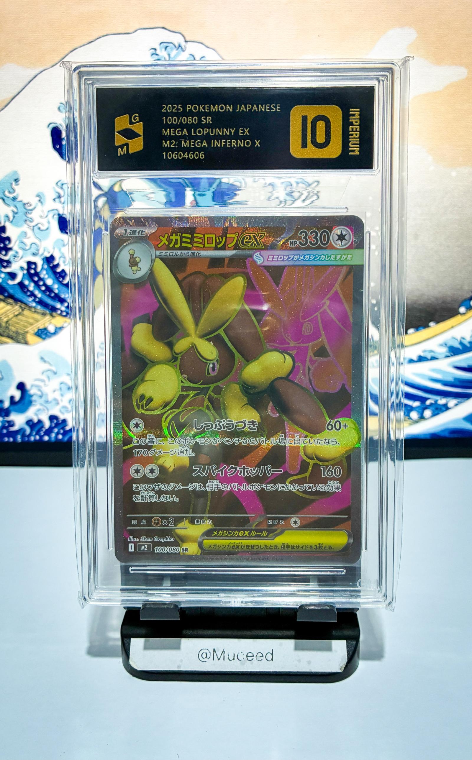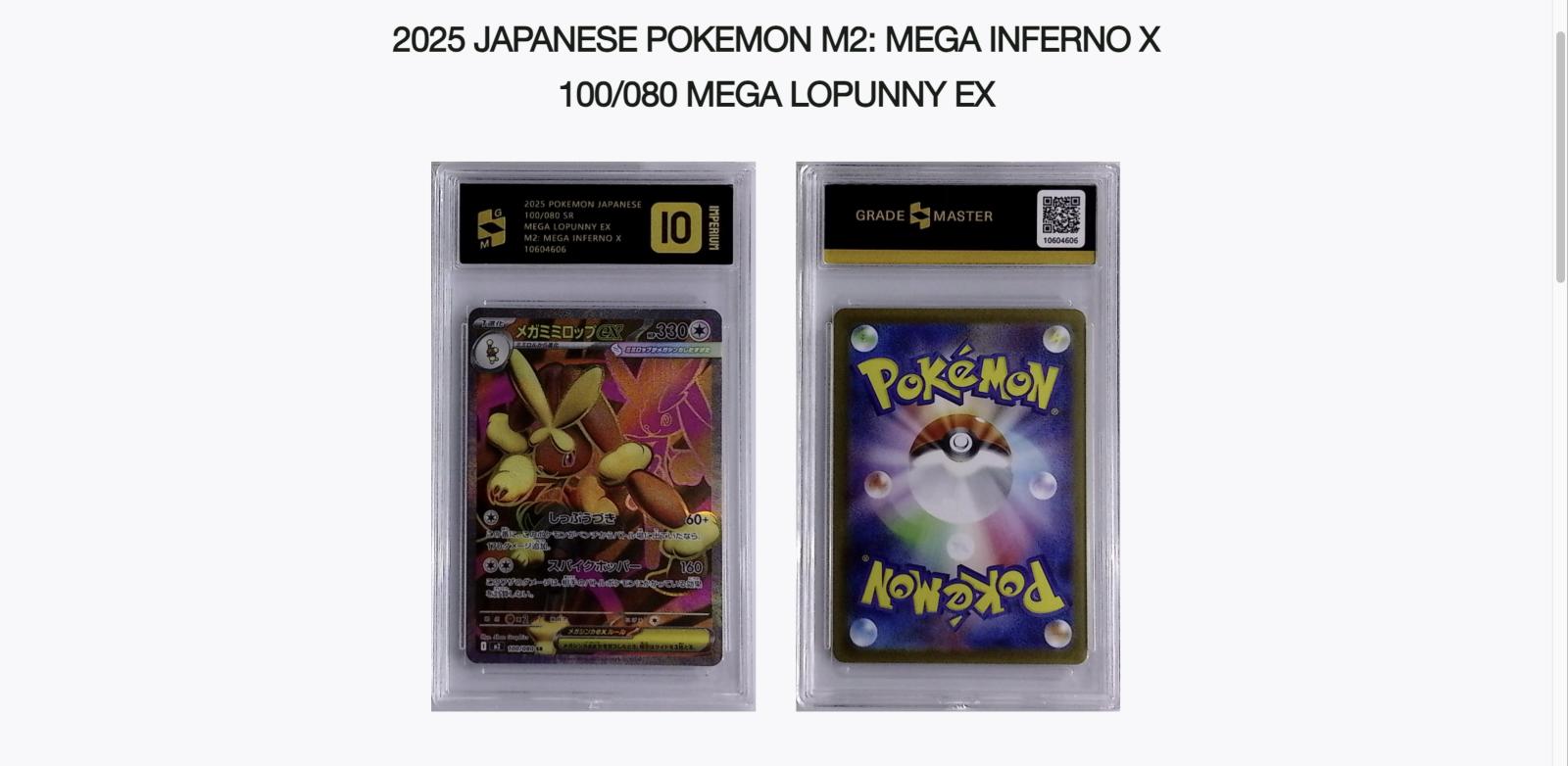 Graded PSA 10 by Grade Master. 2025 Pokemon Japanese Mega Lopunny EX from M2: Mega Inferno X set. Card number 100/080 SR with collector code 10604606. Illustrated by shan Graphics. This is a secret rare foil card in Japanese, showcasing a playable card with strong competitive potential as well as collectible value.