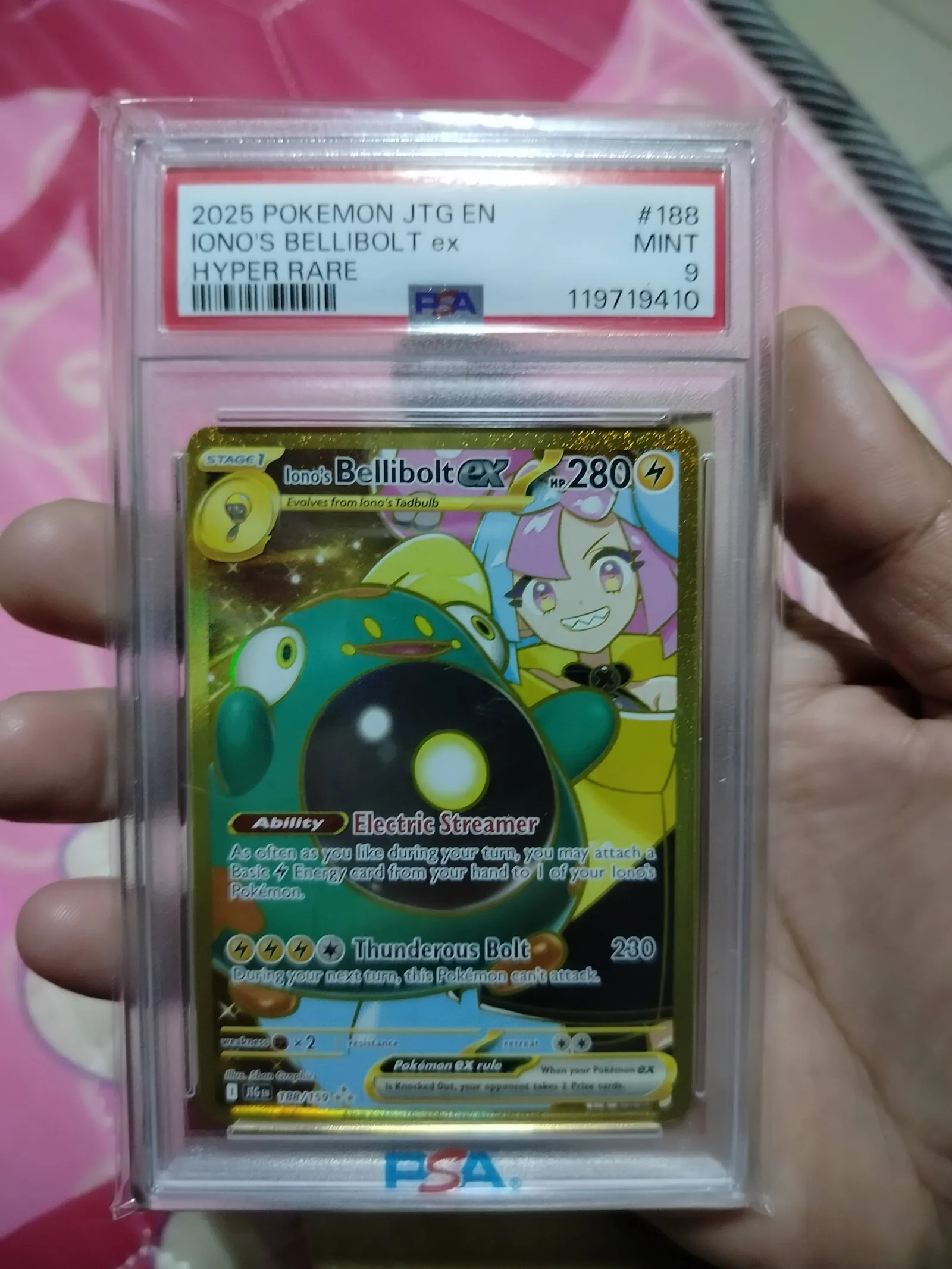 A 2025 Pokémon Japanese Trading Game (JTG) card featuring Iono's Bellibolt EX, graded PSA 9 Mint. This hyper rare card showcases Bellibolt with 280 HP and the Electric Streamer ability. It is encased in a protective PSA slab ensuring its authenticity and condition. Note: This card belongs to the Pokémon TCG series and is not related to One Piece TCG.