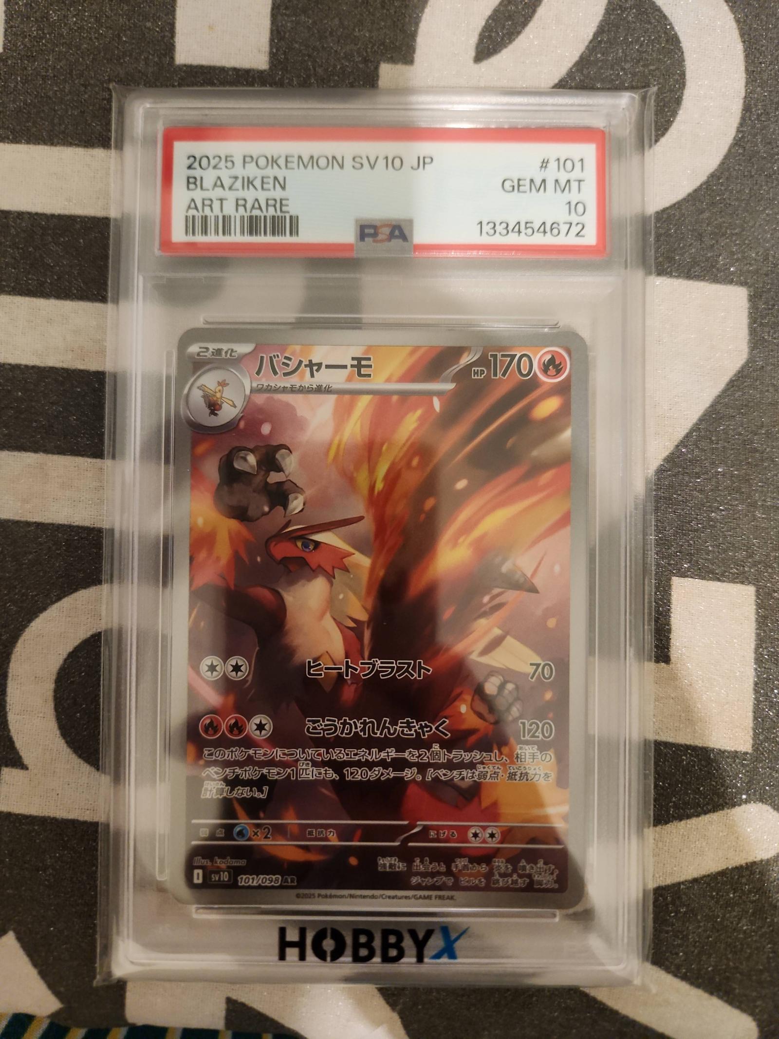 This is a 2025 Japanese Blaziken Art Rare from the Pokemon SV10 set, card number 101/098. It is a PSA graded Gem Mint 10 card, featuring artwork by 5ban Graphics. The card is playable in the meta and is a sought-after collectible for fans of the Pokémon TCG. The PSA slab ensures its protection and authenticity.
