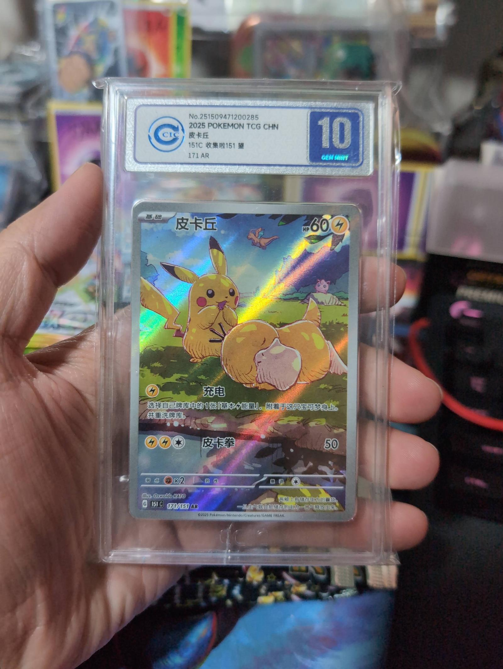 Graded GEM MINT 10 by CTC for this 2025 Pokemon TCG Chinese Pikachu card, card number 171/151 AR. Artwork by Ovidio Lillo. This foil card is part of the 2025 set and is a collectible with reverse holo printing treatment.