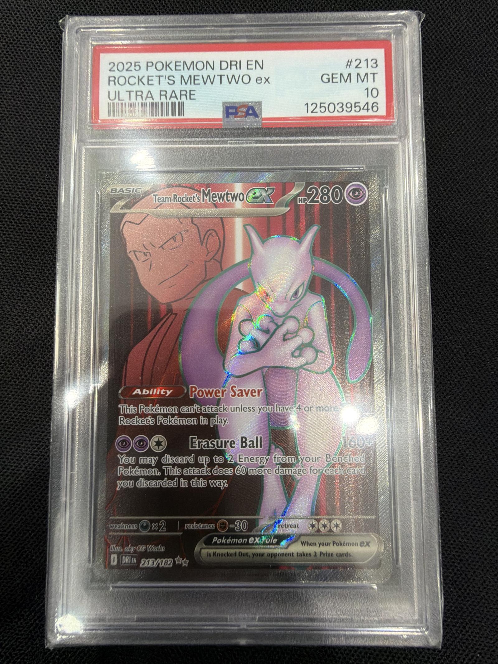 Graded PSA Gem Mint 10 Ultra Rare Rocket's Mewtwo ex from the 2025 Pokemon DRI set. Card number 213/182. This card is foil and features artwork by 5ban Graphics. Highly collectible and playable in the meta due to its powerful abilities.