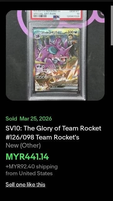 Graded PSA GEM MT 10 card from the 2025 Pokémon SV10 set. This Rocket's Nidoking ex is a Special Art Rare (SAR) card, numbered 126/098. It is in Japanese and features artwork by Unisoni. The card is foil and highly collectible, with strong appeal to collectors due to its PSA 10 grade and special art status. While powerful, ex cards from this set are generally more collectible than meta-defining competitive cards.