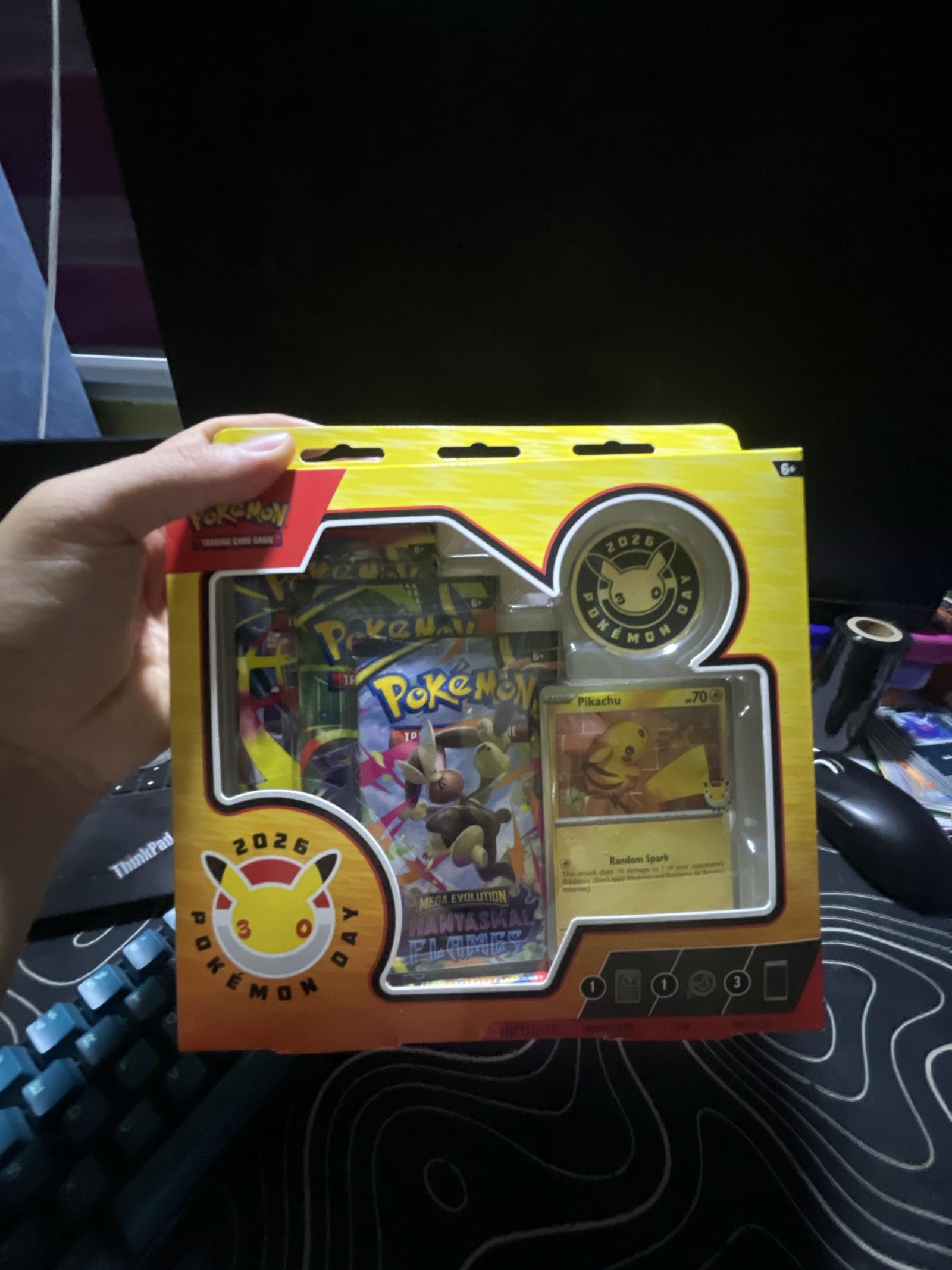 This 2026 Pokémon Day special pack includes a promo Pikachu card with the 'Random Spark' attack, card number and set code not specified, featuring iconic artwork celebrating Pokémon Day 2026. The pack also contains multiple booster packs including Mega Evolution and others for expanding your playable collection. The Pikachu promo card is a collectible with playability depending on current meta format. Packaging emphasizes the 2026 Pokémon Day event. Language code and printing treatment details are not provided.