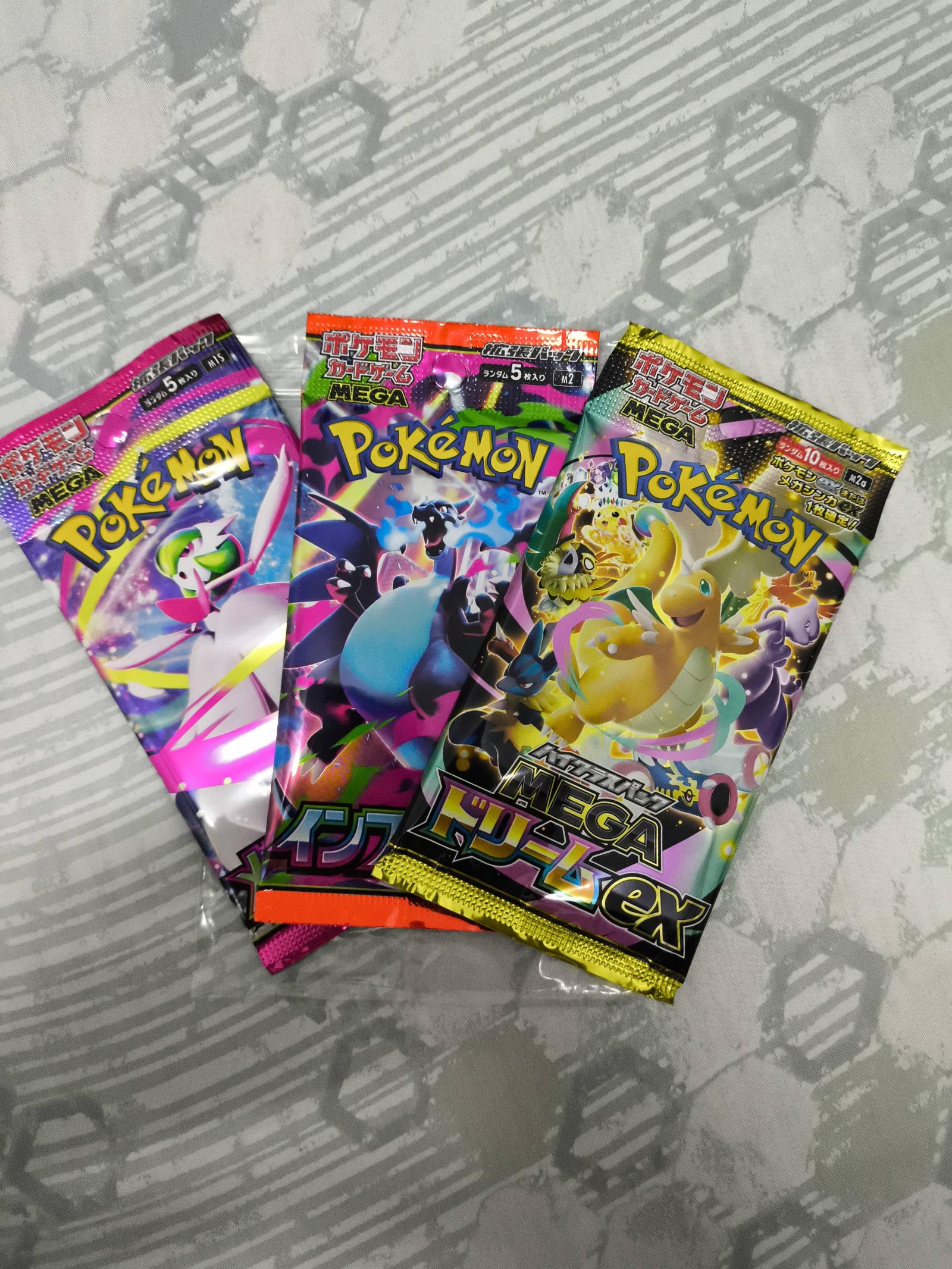 This product includes three unopened Japanese booster packs ,mega dream,mega sym and inferno x,each pack last three card collect HP total 9 card to count the HP