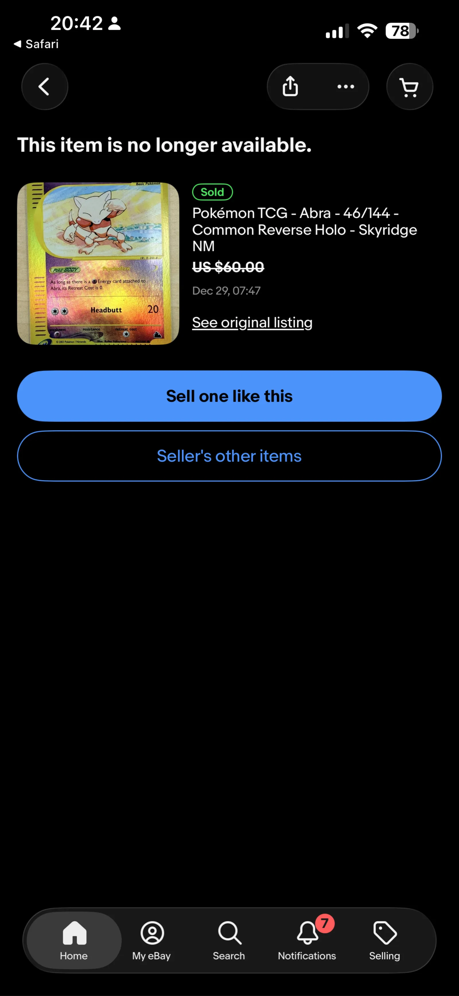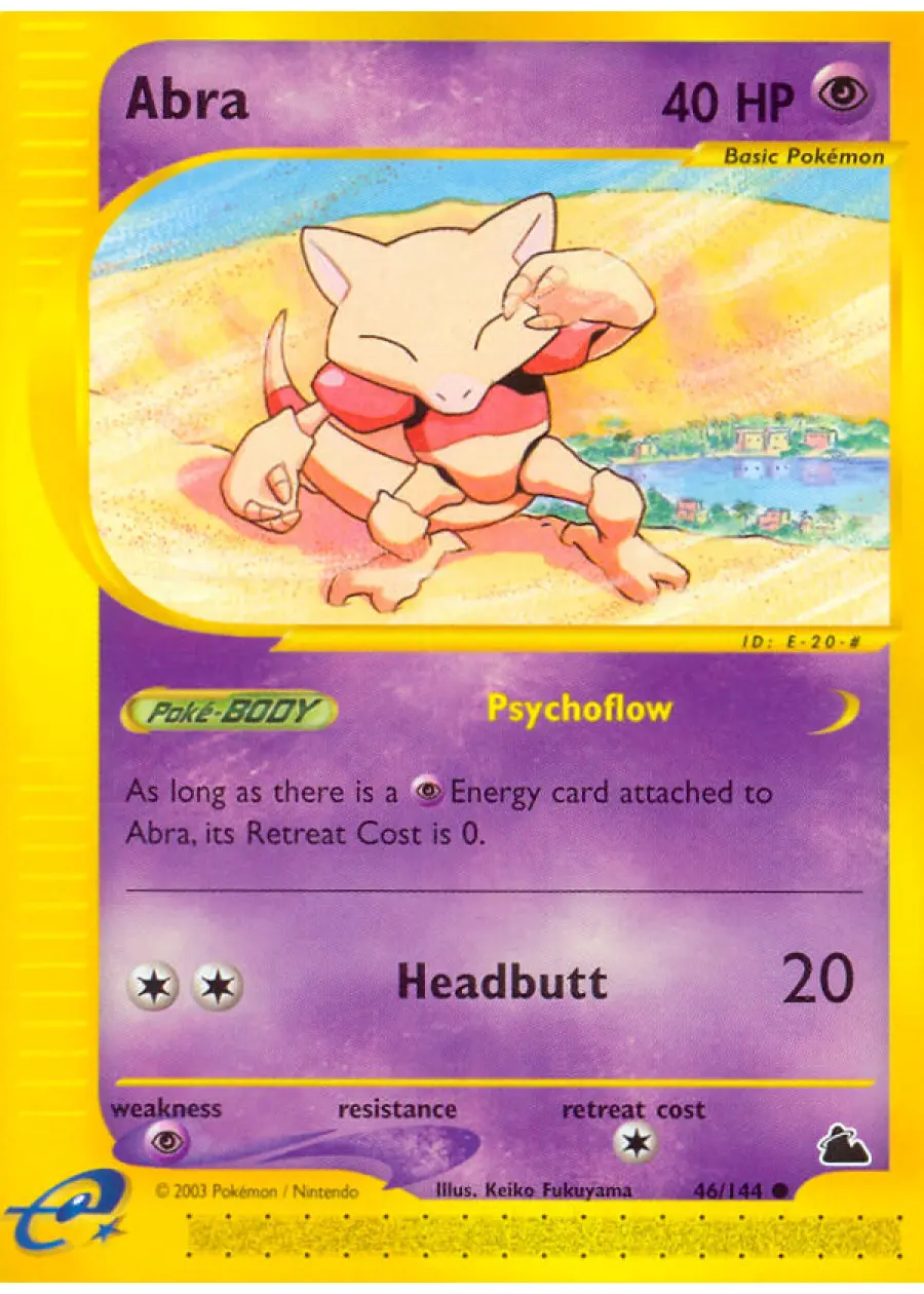 Abra card number 46/144 from the Skyridge E Series set released in 2003 by WOTC. Illustrated by Keiko Fukuyama. This reverse foil holo card features Abra with 40 HP and the move Headbutt. The card is in English and is a collectible reverse holographic card from the E Series set, not highly played in competitive meta but valued for collectors. Damage during shipping is at your own risk ! No cancellation or refunds accepted.