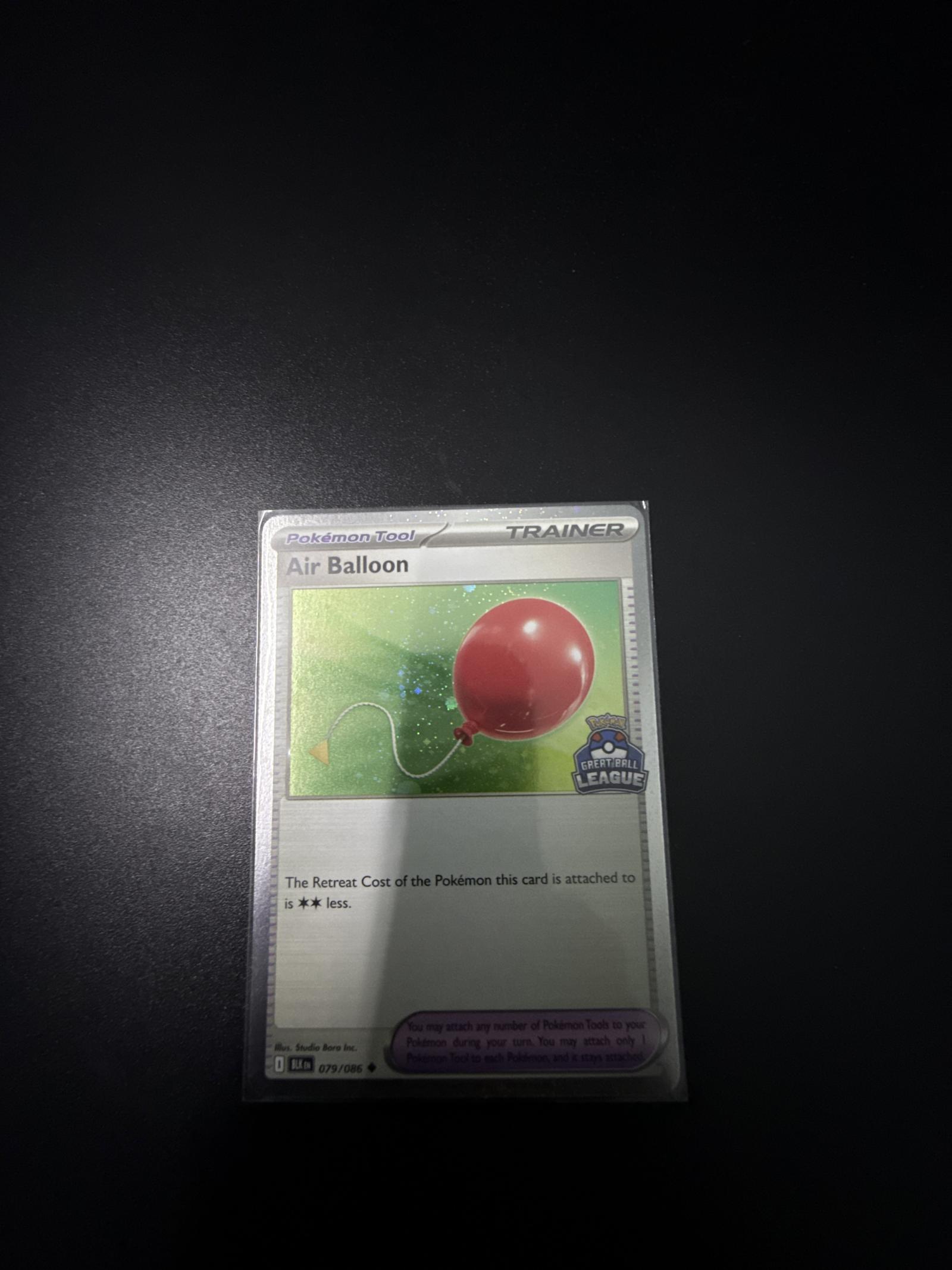 Air Balloon is a Trainer Pokémon Tool card from the Sword & Shield Black Star Promo set (SWSH-BSTAR) with card number 79/86. Illustrated by kodama, this card reduces the Retreat Cost of the Pokémon it is attached to by 2. It is a holo collectible promo card, playable in the meta as a useful tool for deck retreat strategies. This card also features the Great Ball League promo stamp.