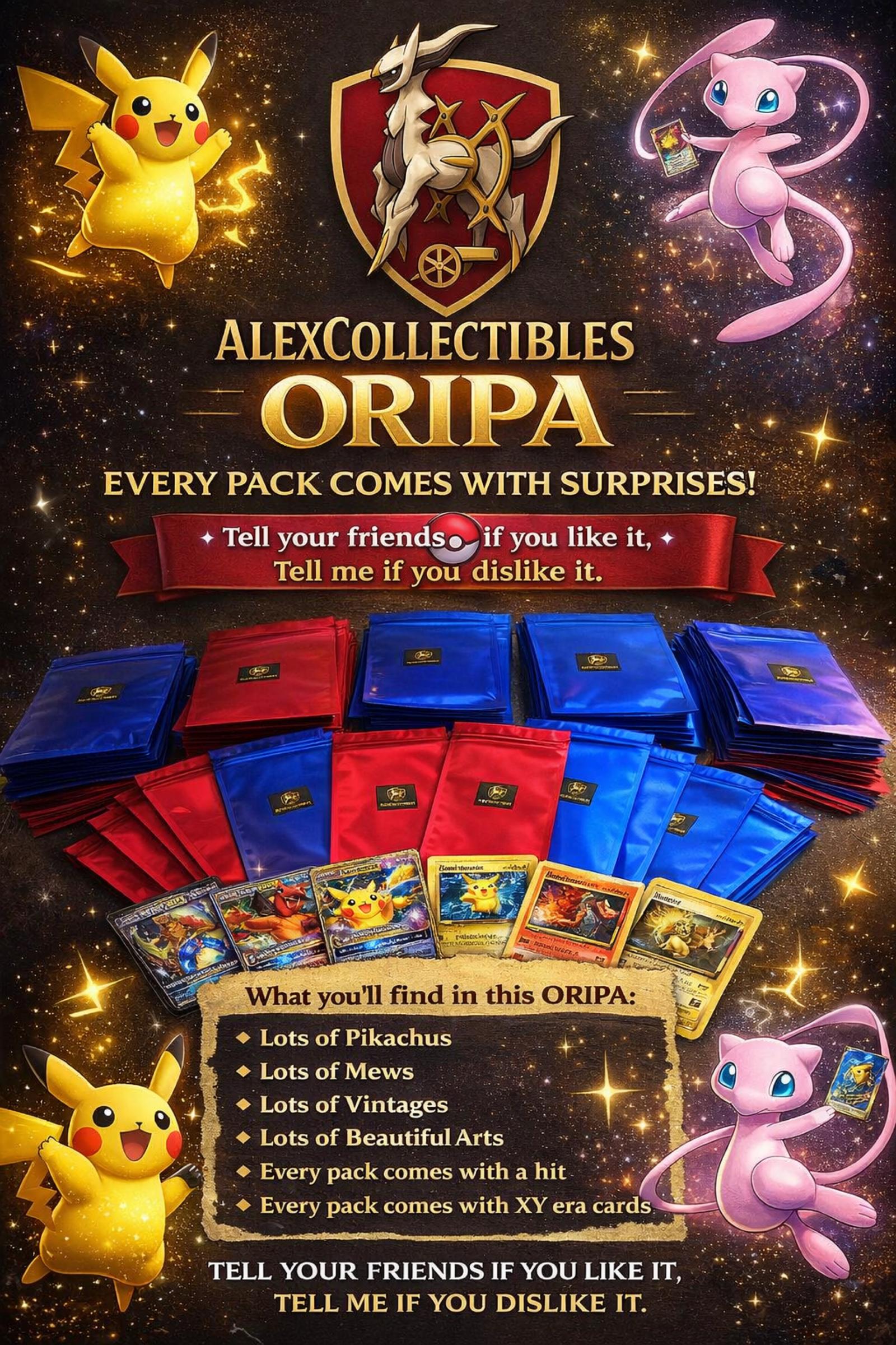 AlexCollectibles ORIPA surprise packs contain a diverse selection of Pokémon cards, including multiple Pikachu and Mew cards, vintage cards, beautiful art cards, and guaranteed hits. Each pack also includes cards from the XY era, making it both collectible and potentially playable in formats supporting XY cards. Great for collectors and players seeking variety and unique pulls.