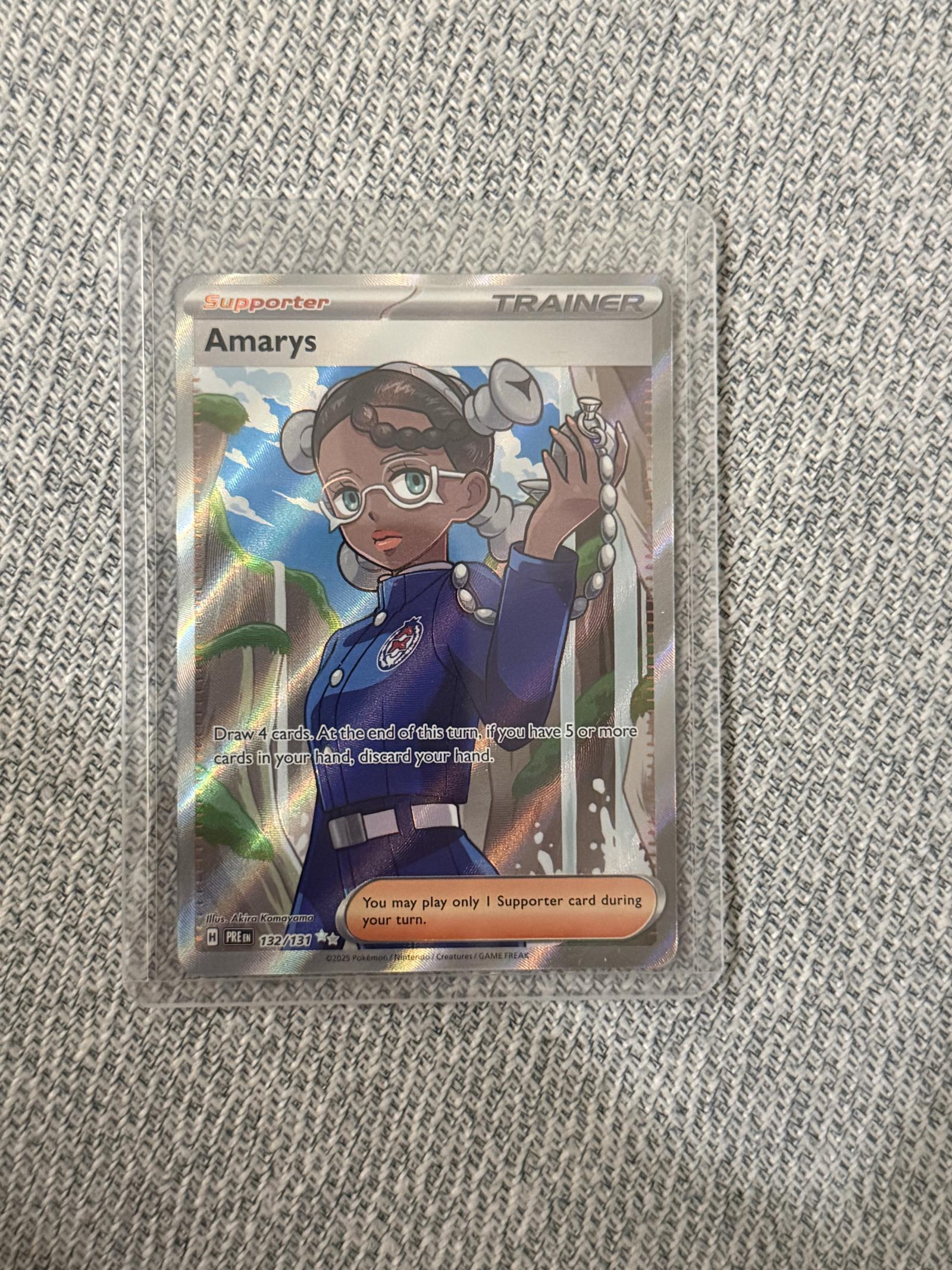 Amarys Trainer Supporter card from the Pokemon TCG set PR-E (Promos). Card number 132/131, illustrated by Akira Komayama. Features a full art holographic foil. Playable support card useful for drawing cards but with a discard condition. Collectible and playable in certain decks.