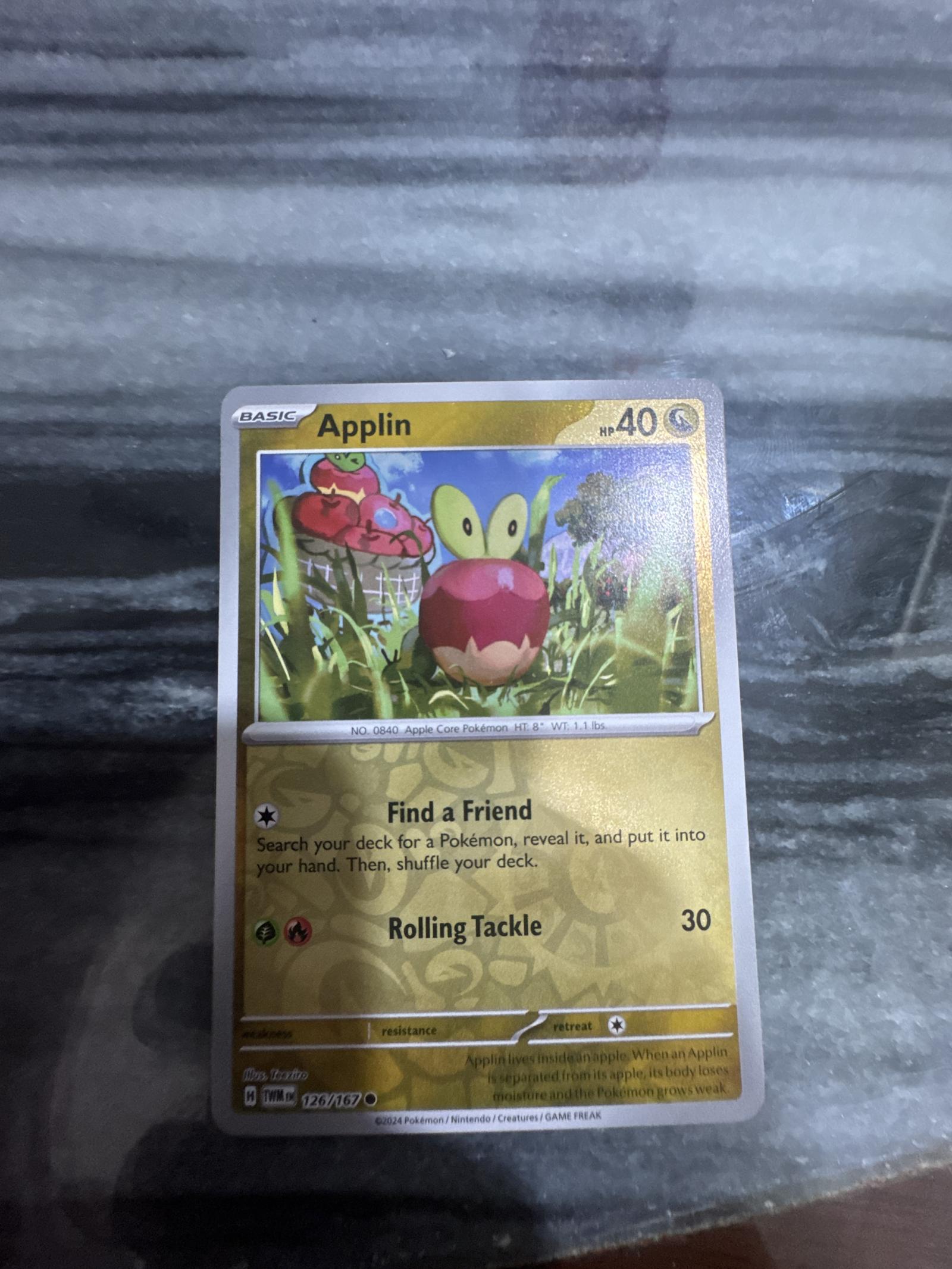 Applin (card code 126/167) from the Sword & Shield set. Illustrated by an unnamed artist. This holo rare card features the Pokémon Applin with moves Find a Friend and Rolling Tackle. It is playable in the Pokemon TCG meta as a basic Pokemon and valued for both play and collection. The card is foil.