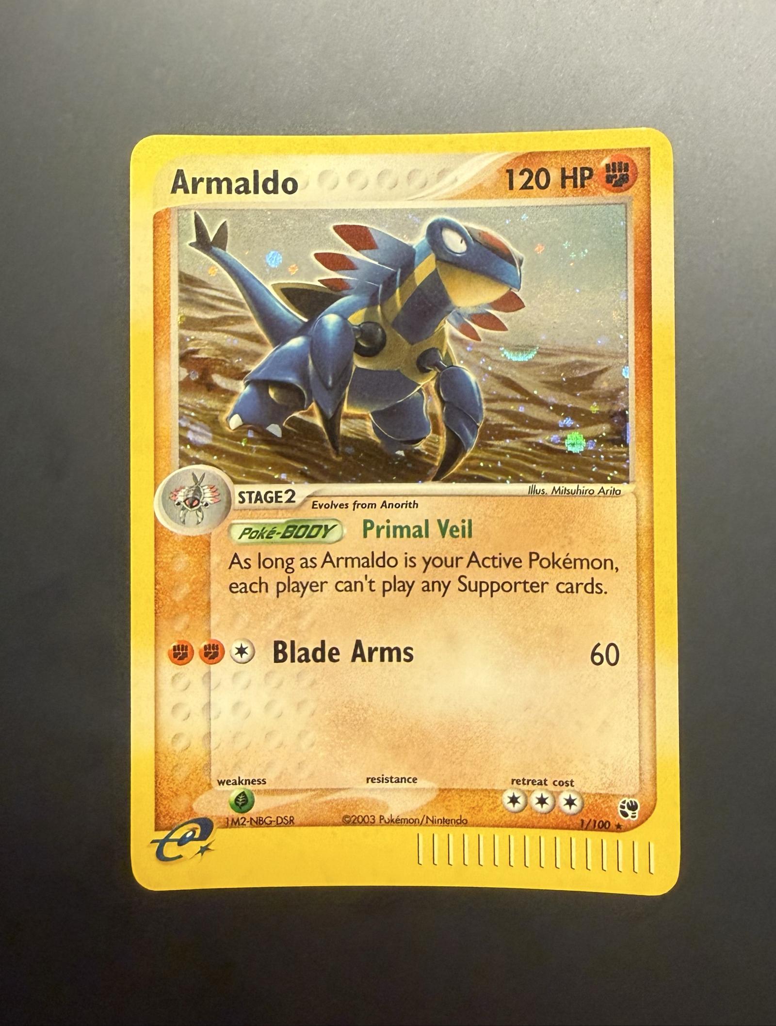 Armaldo holo rare card from the EX Sandstorm set (set code e-Card). Card number 1/100 with artist Mitsuhiro Arita. Features Primal Veil Poké-BODY and Blade Arms attack. Printed in English with foil holographic treatment. This card is collectible and was part of the early 2000s Fossil expansion in the Pokémon TCG.