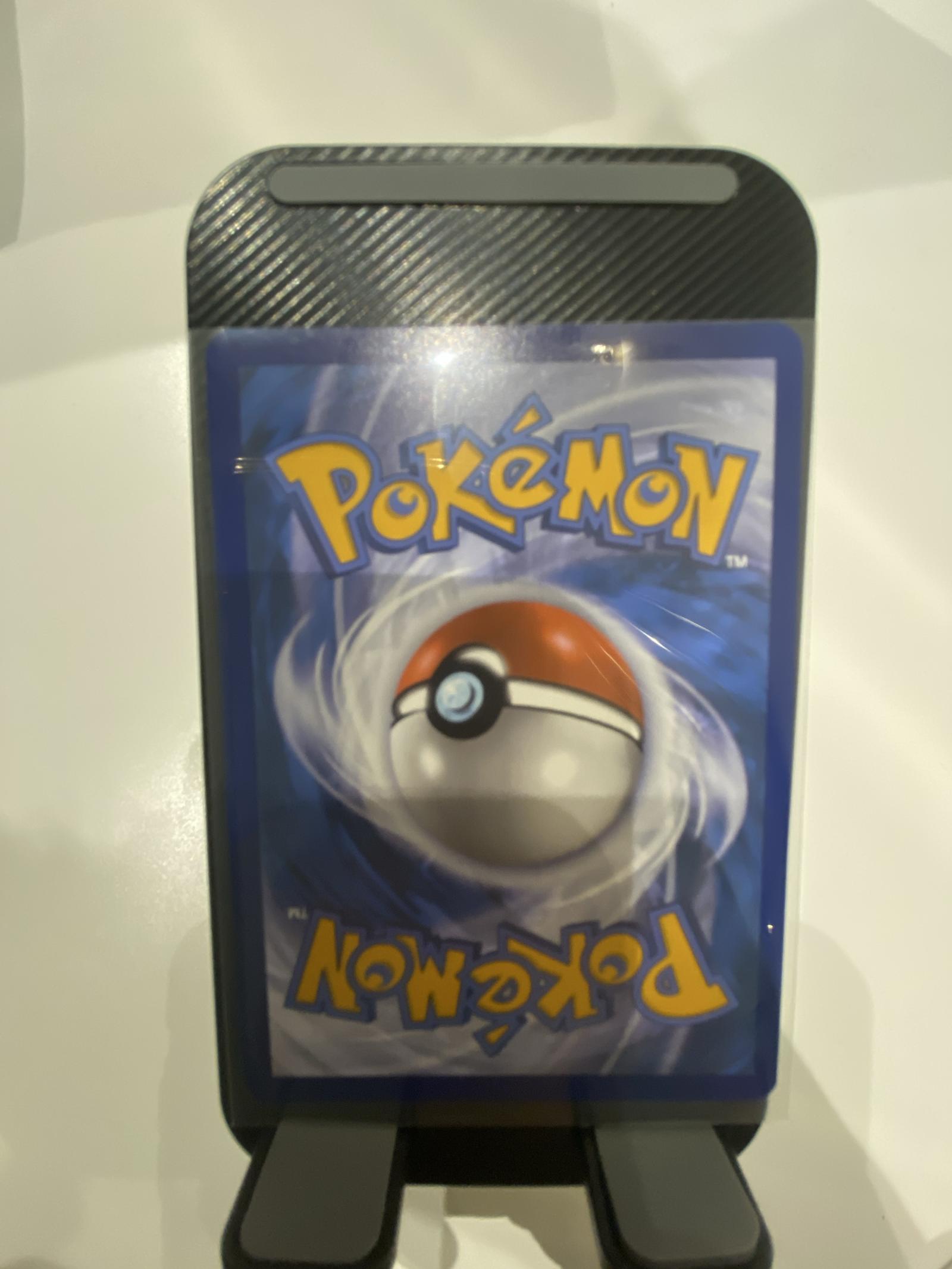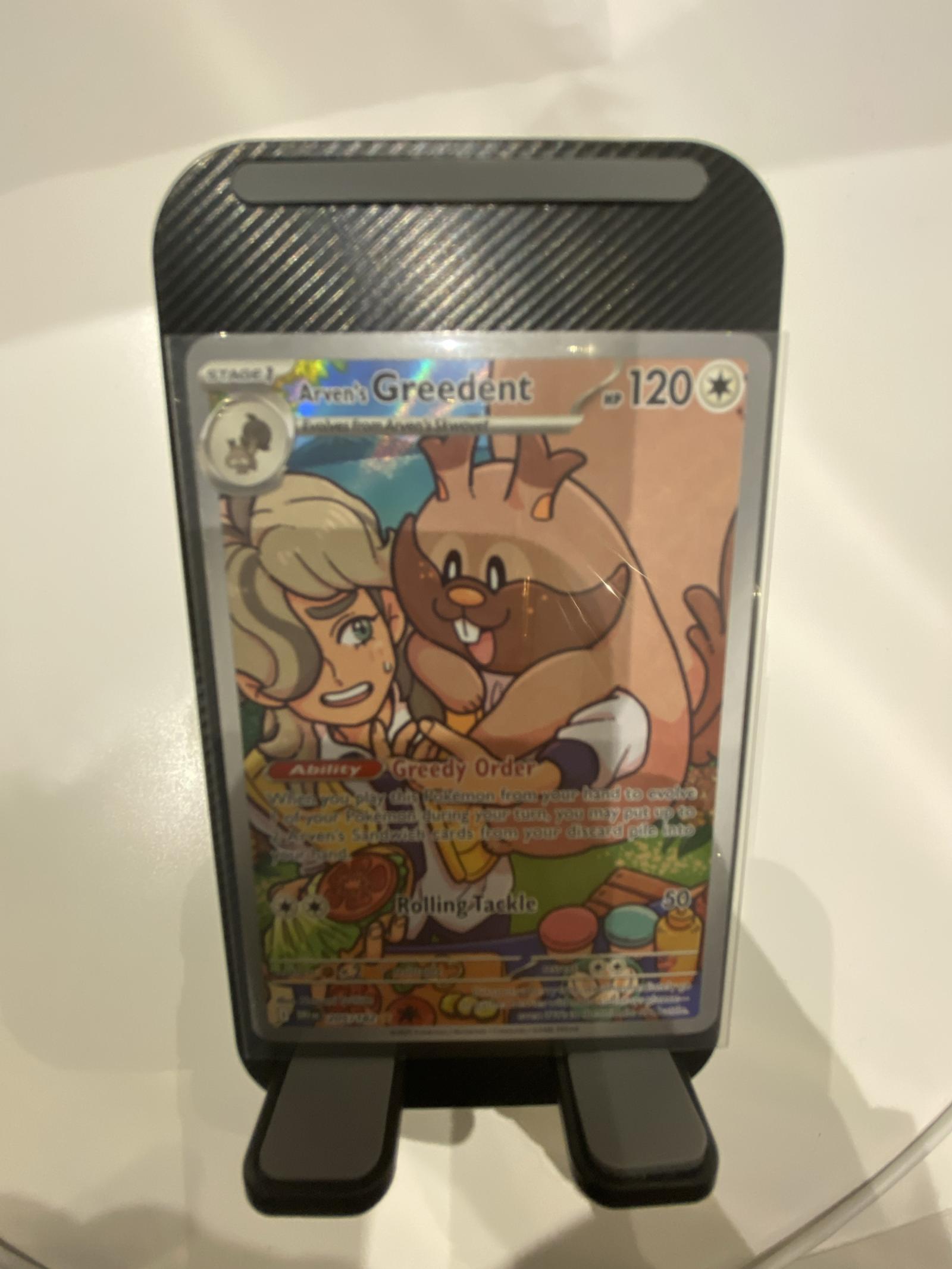 A full art holographic Arven's Greedent Pokemon card featuring 120 HP and the ability 'Greedy Order'. Card is sleeved and displayed standing, showing vibrant colors and artwork. Suitable for collectors of modern Pokemon cards.