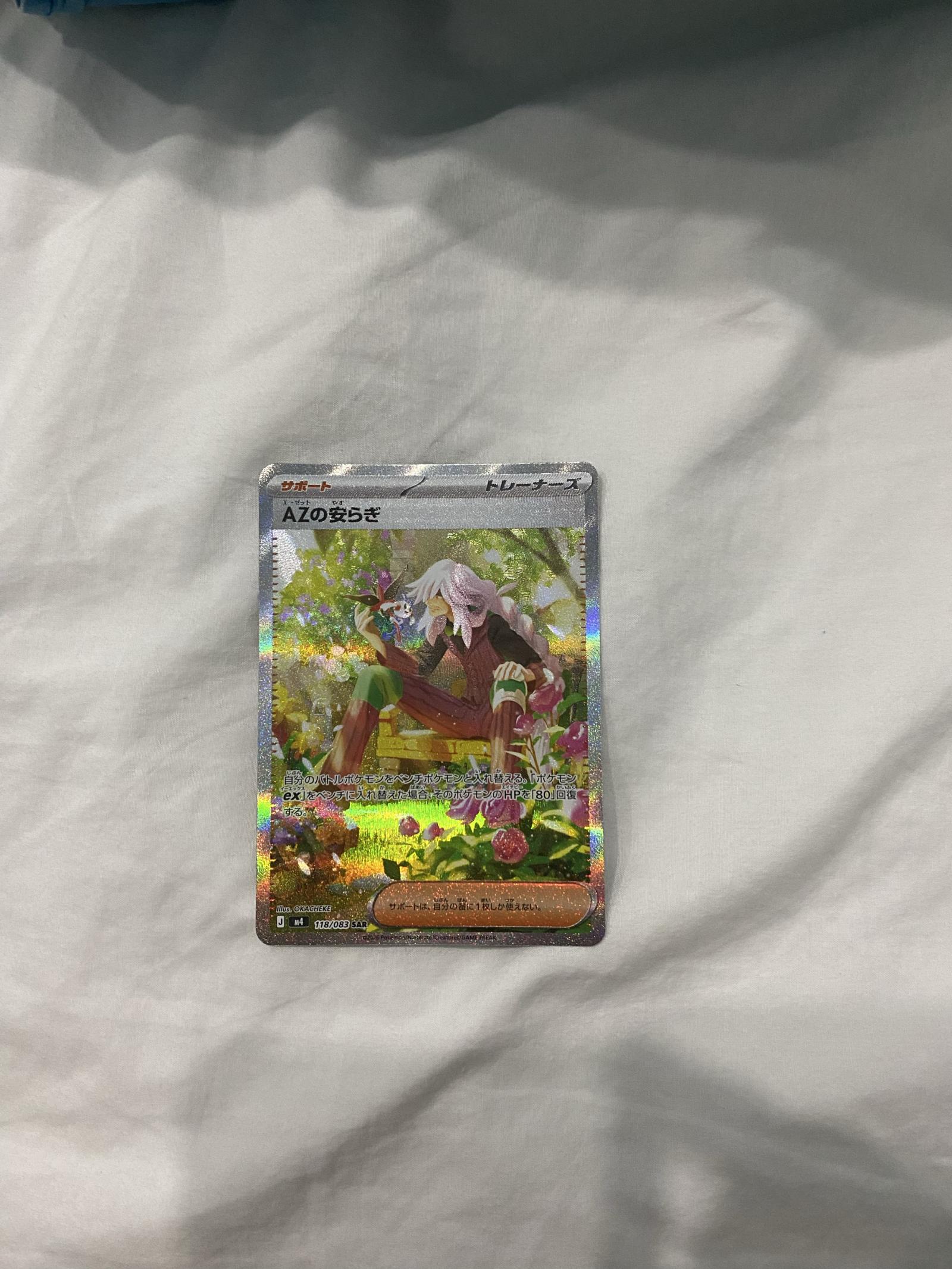 A beautifully illustrated SAR Trainer card – AZ’s Kindness, featuring a serene and emotional scene filled with soft lighting and floral elements. The artwork captures a rare calmness that stands out strongly among modern Pokémon cards, making it highly desirable for collectors who appreciate storytelling and aesthetic depth.