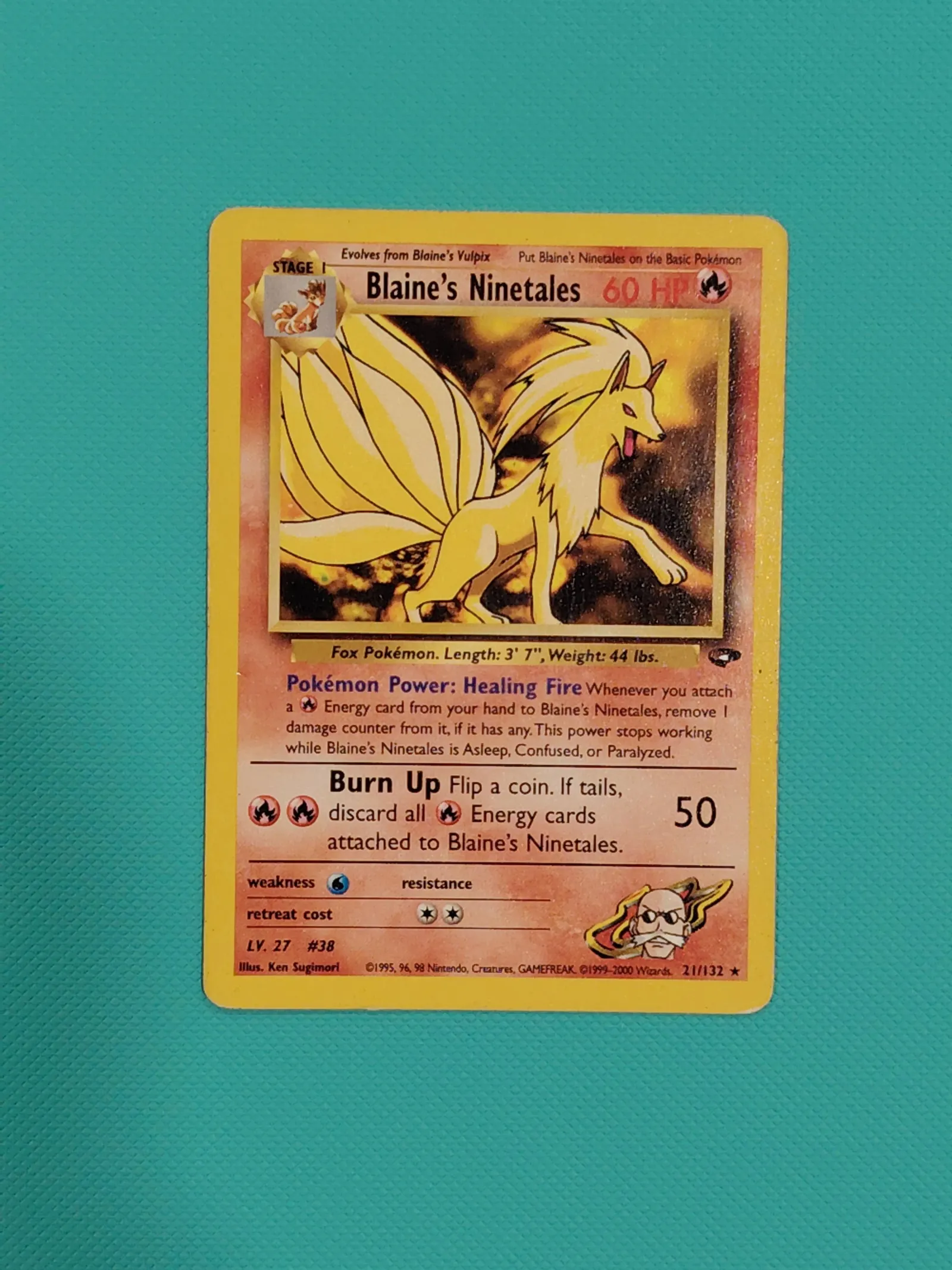 Blaine's Ninetales card from Base Set 2 (1999-2000) illustrated by Ken Sugimori. Card number 21/132. This card features the Pokémon Power Healing Fire and the attack Burn Up. It is in English and is a normal print. Collectible and playable in nostalgic formats.