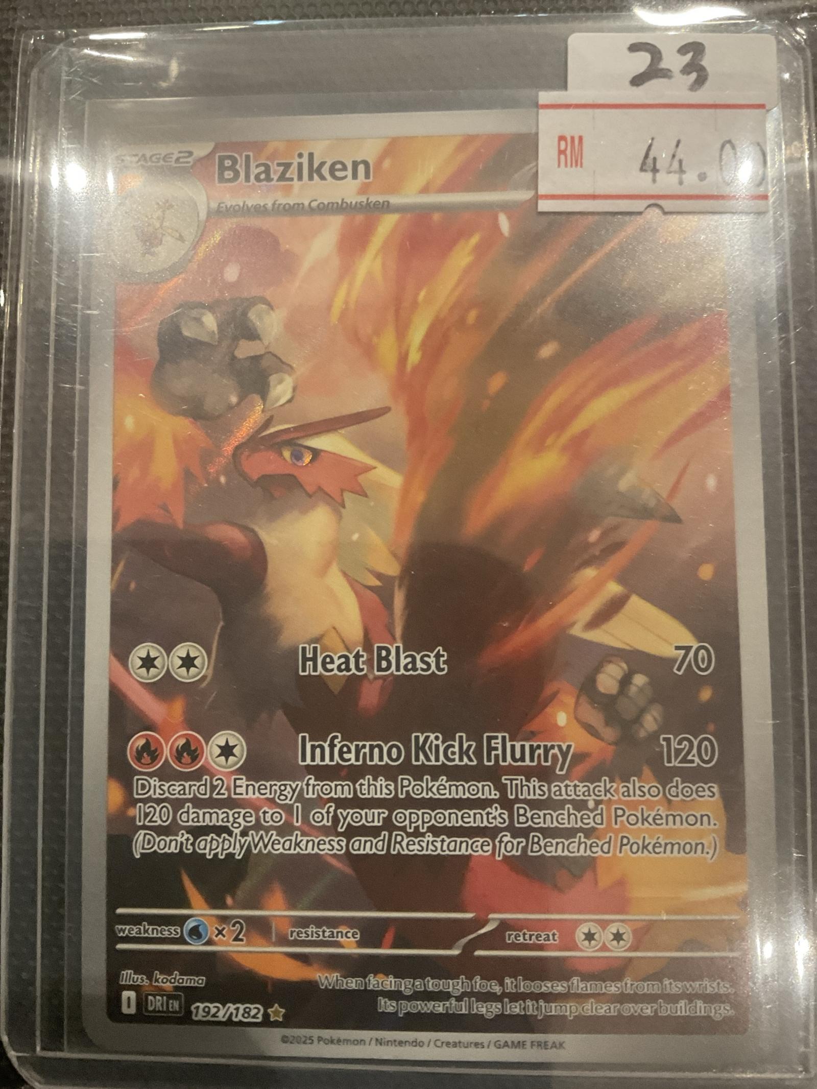 Blaziken card number 192/182 from the Sword & Shield set (DRI), illustrated by kodama. This is a full art foil card featuring powerful attacks Heat Blast and Inferno Kick Flurry. The card is collectible and playable in the current meta. Card code: 192/182. English language.