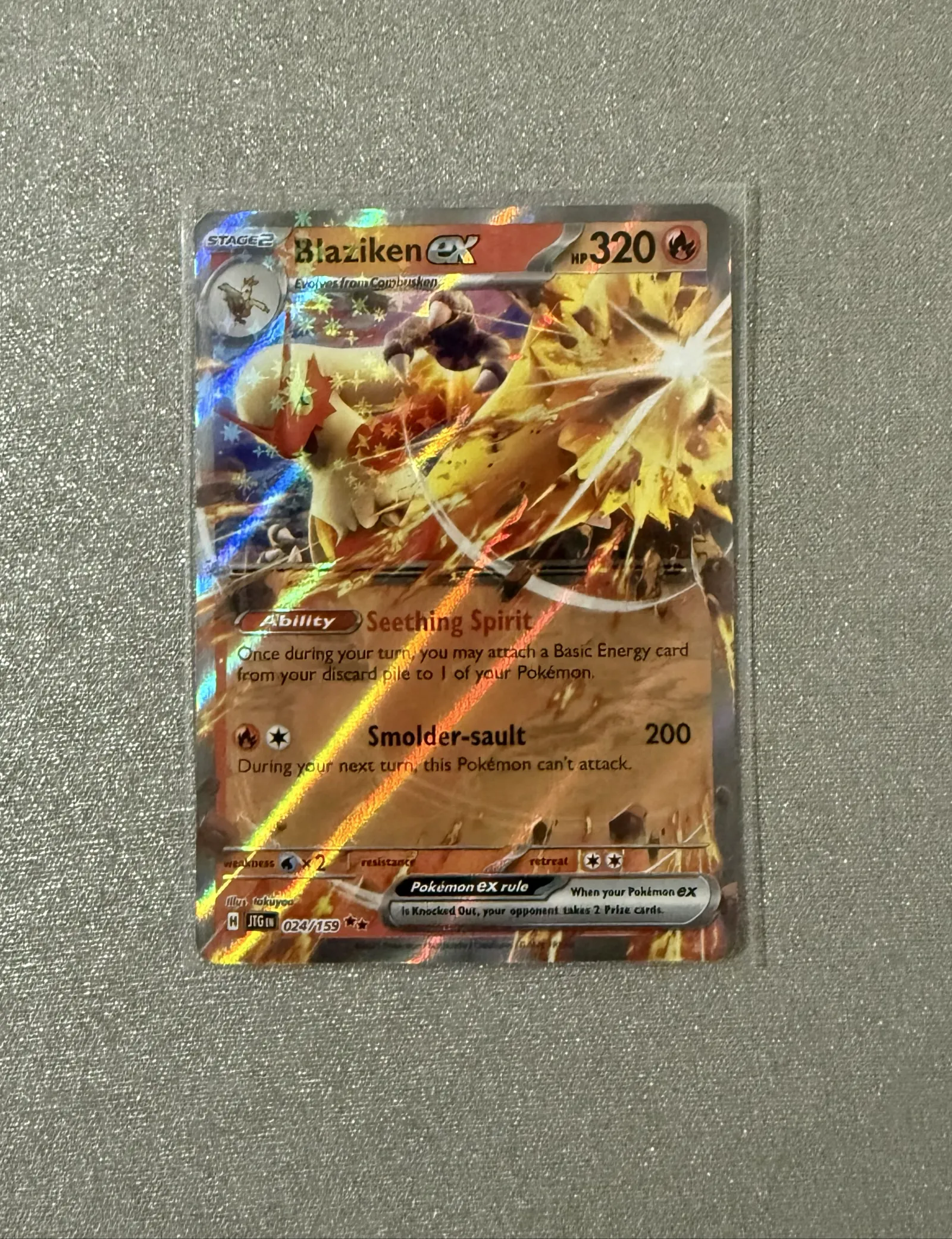 Blaziken ex card number 024/159 from the Pokemon TCG set. The card features artwork by Illus. tokuyuki and is foil holographic. This is a Stage 2 Fire type Pokémon with 320 HP. Includes the Abilty 'Seething Spirit' and the attack 'Smolder-sault' dealing 200 damage. Playable card in the meta with a Pokemon ex rule. Language code is English. Printing treatment is holo.