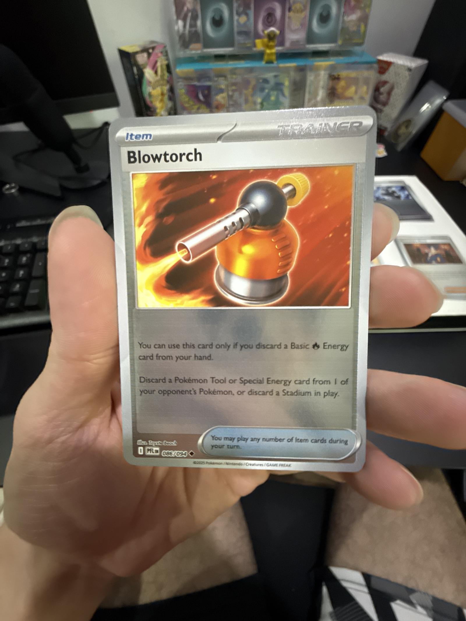 Blowtorch, card number 086/094 from the set PFL This is a Trainer Item card usable in gameplay. The card is non-foil with normal printing treatment and English language. The card is playable in the meta as a discard tool for Basic Fire Energy and disrupting opponent's tools or Stadiums.