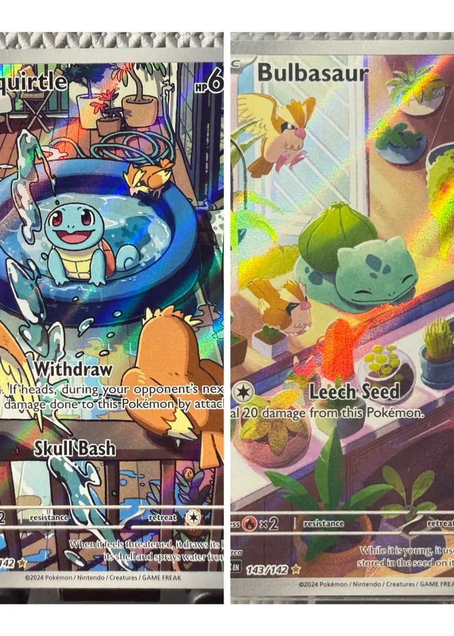 The Squirtle card displays the fan-favorite Water-type starter enjoying a playful scene with other Pokémon, rendered by a featured Pokémon artist. Bulbasaur is depicted in a tranquil, plant-filled room, creating plenty of collector appeal. Both are secret rare cards, outnumbering their set (148/142 and 143/142), which makes them particularly sought after among collectors.