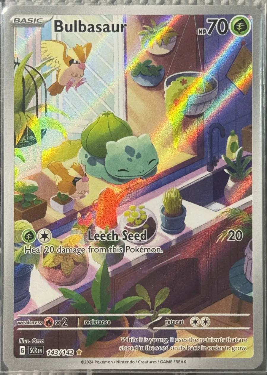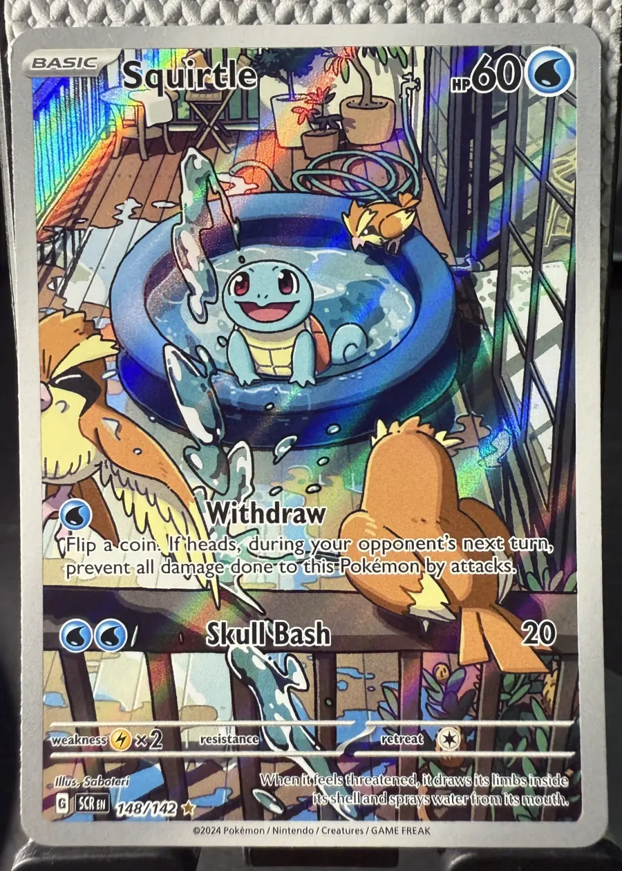 Green & Blue This listing features two vibrant illustration rare cards from the 2024 Pokémon TCG set: Squirtle 148/142 and Bulbasaur 143/142. Both cards are in raw, ungraded condition and exhibit a stunning full-art holofoil finish that highlights their adorable, slice-of-life artwork.