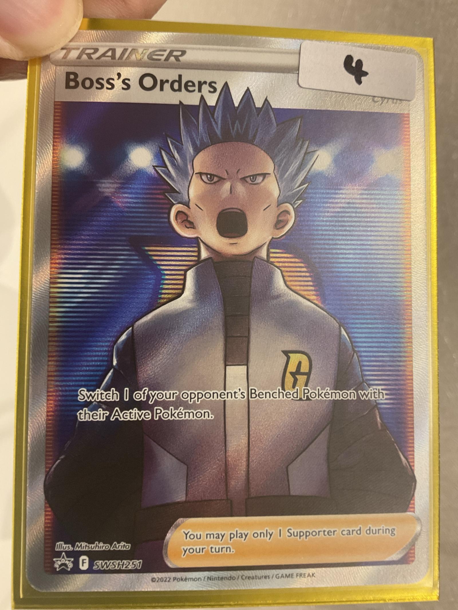 Boss's Orders Trainer card from the Pokémon Sword & Shield set. Illustrated by Mitsuhiro Arita. Card number SWSH251. This is a full art foil card and highly collectible. The card is playable in competitive formats as a strong supporter card allowing you to switch one of your opponent's benched Pokemon with their active Pokemon.