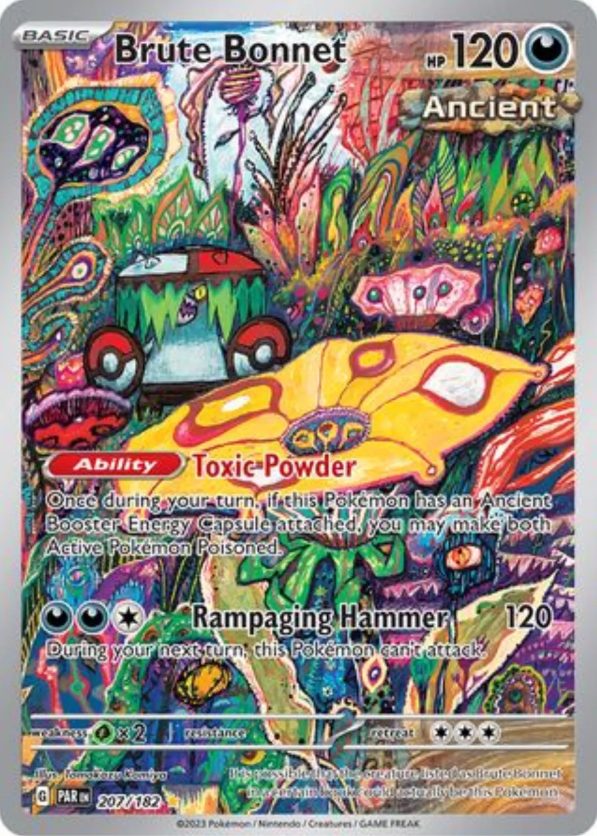 Featuring a vibrant and highly detailed artwork, the card showcases Brute Bonnet with an intricate background full of colorful, abstract designs. The card's ability, "Toxic Powder," and its move, "Rampaging Hammer" (120 damage), make it notable for gameplay in the Ancient Booster format.