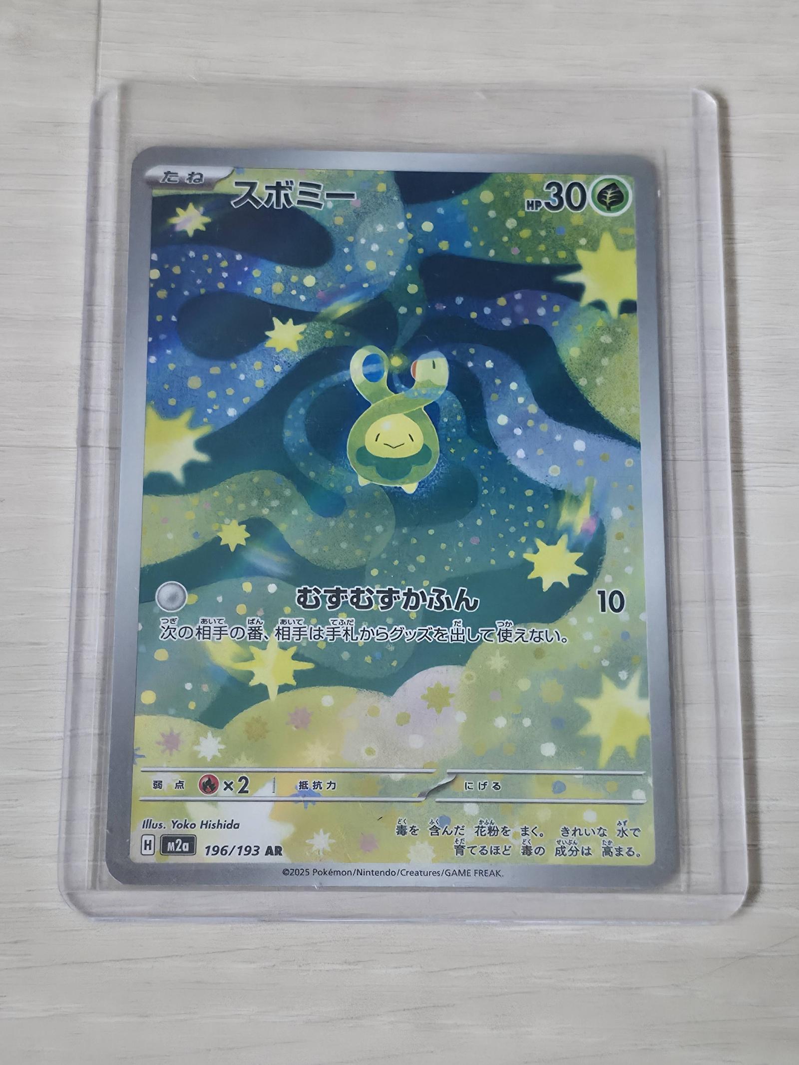 Budew (Japanese: スボミー) card number 196/193 AR from the M2a set. Illustrated by Yoko Hishida. This is a holofoil card from the 2025 Pokémon M2a set. Card is in Japanese and features a unique artwork style. The card is collectible and popular. Sleeved and Toploadered after pulled.