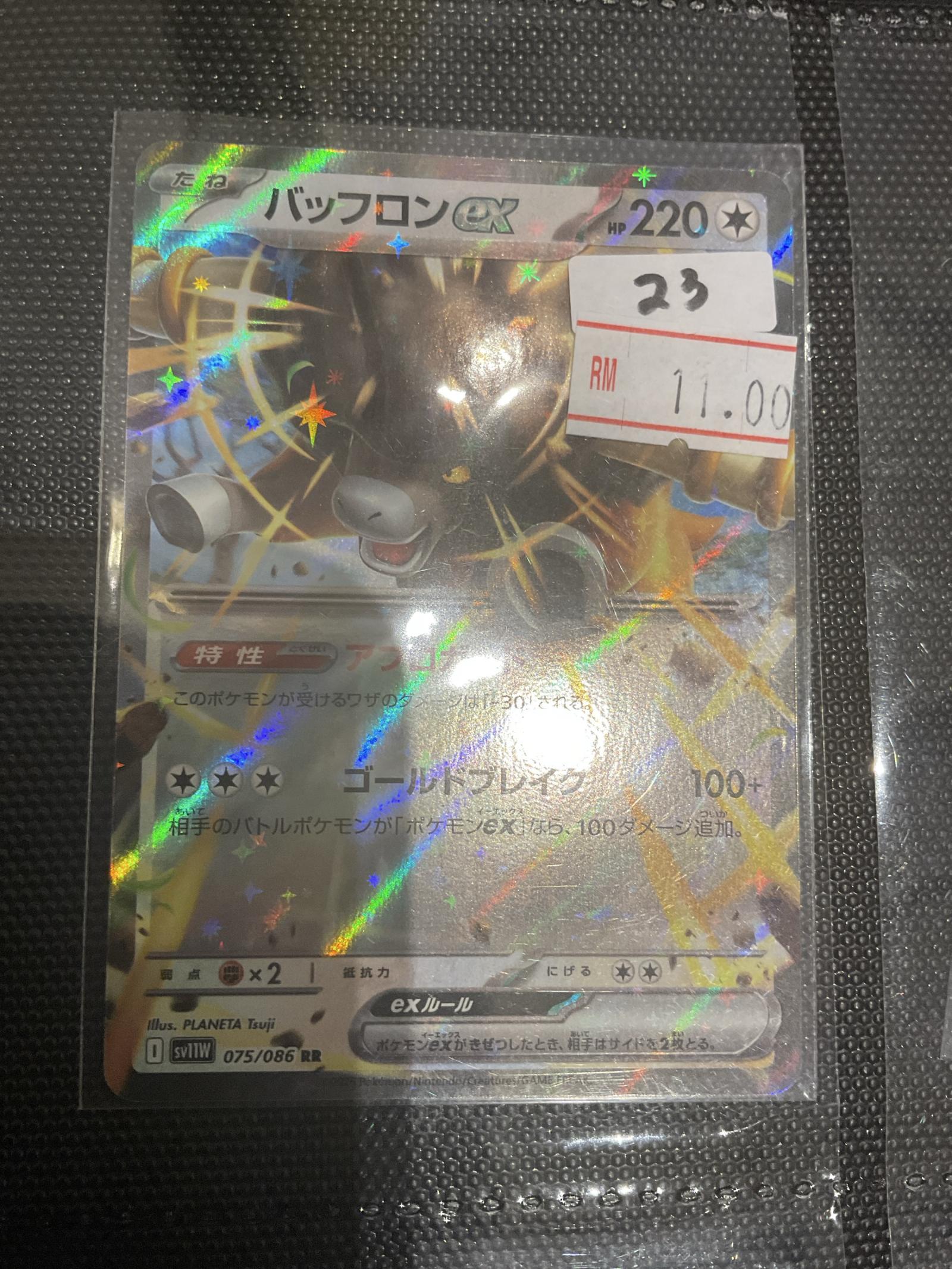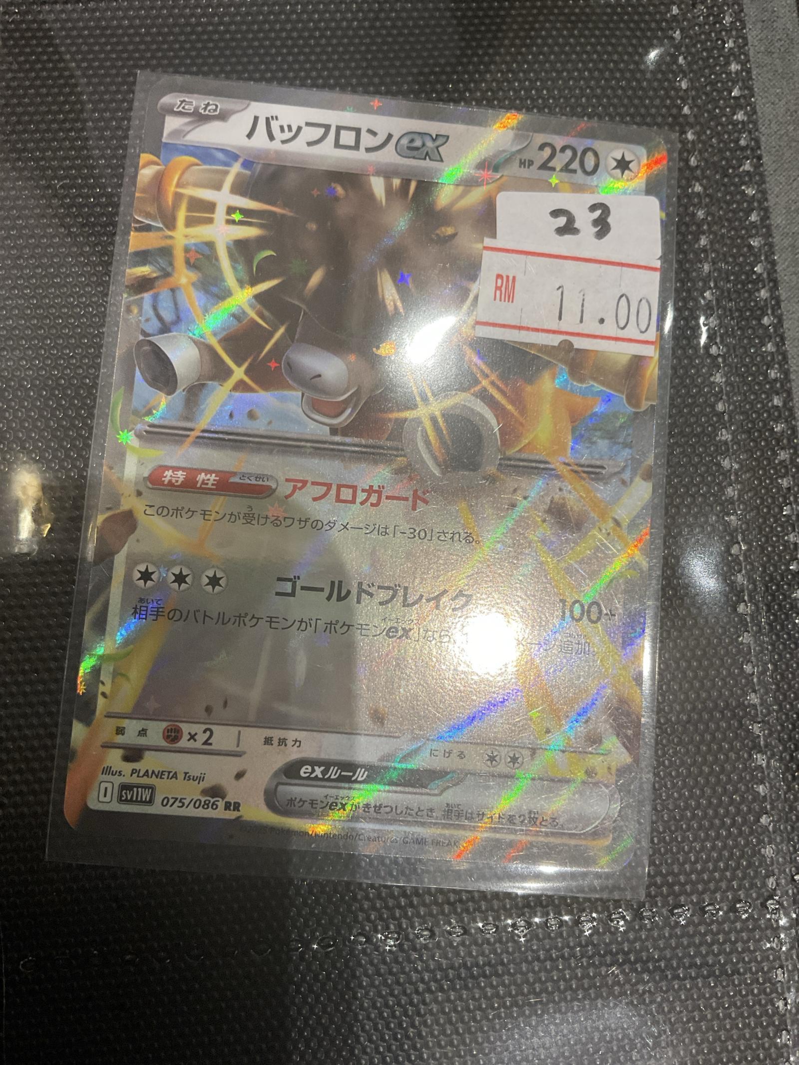 Japanese Buffalon EX card (075/086) from the Sword & Shield V (sv11W) set. Illustrated by PLANETA Tsuji. This is a reverse holo rare card. Playable in the current meta and features the EX mechanic. The card shows some shine effects with a foil finish.