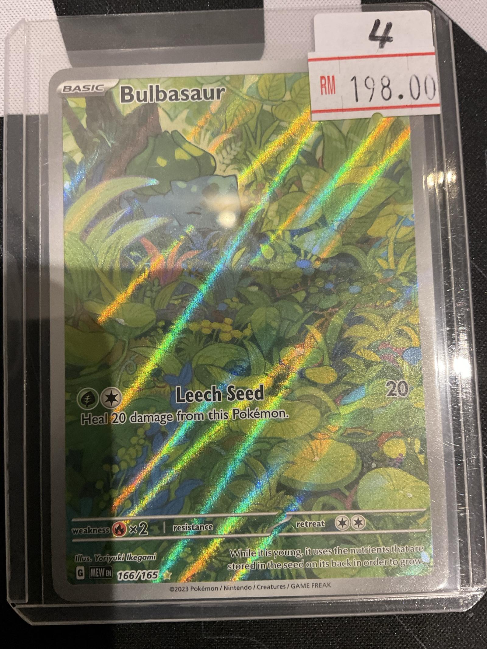 Bulbasaur 166/165 from the MEW set, illustrated by Yoriyuki Ikegami. This 2023 Pokemon TCG card is a full art holo rare with a foil finish. Language is English. The card features the attack Leech Seed and has a collector number one higher than the set size (secret rare). Playable in the Pokemon TCG meta and also highly collectible.
