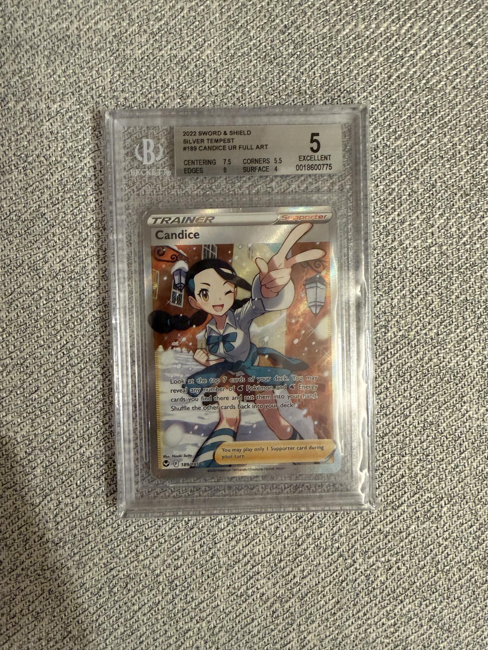 2022 Sword & Shield Silver Tempest set, Candice #189/185 UR Full Art Trainer card. Artist: Naoki Saito. Card is foil and graded Beckett 5 EXCELLENT with subgrades Centering 7.5, Corners 5.5, Edges 8, Surface 4. Playable in meta as a Trainer/support card. Card code: 0018600775.