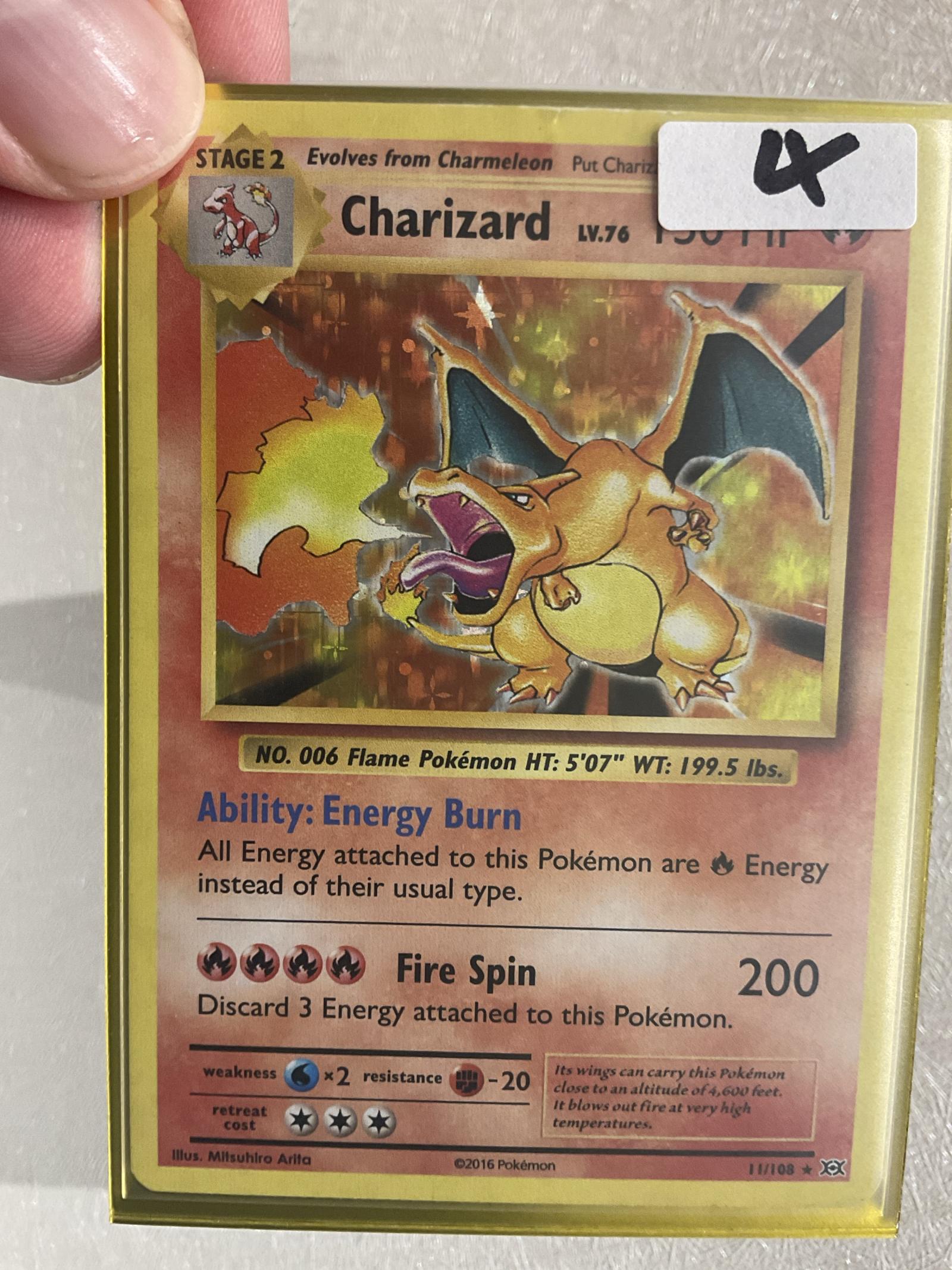 Charizard card from the 2016 XY Evolutions set, card number 11/108. Illustrated by Mitsuhiro Arita, this card features the Energy Burn ability and Fire Spin attack. Holo foil treatment. Playable in various competitive formats, also highly collectible.