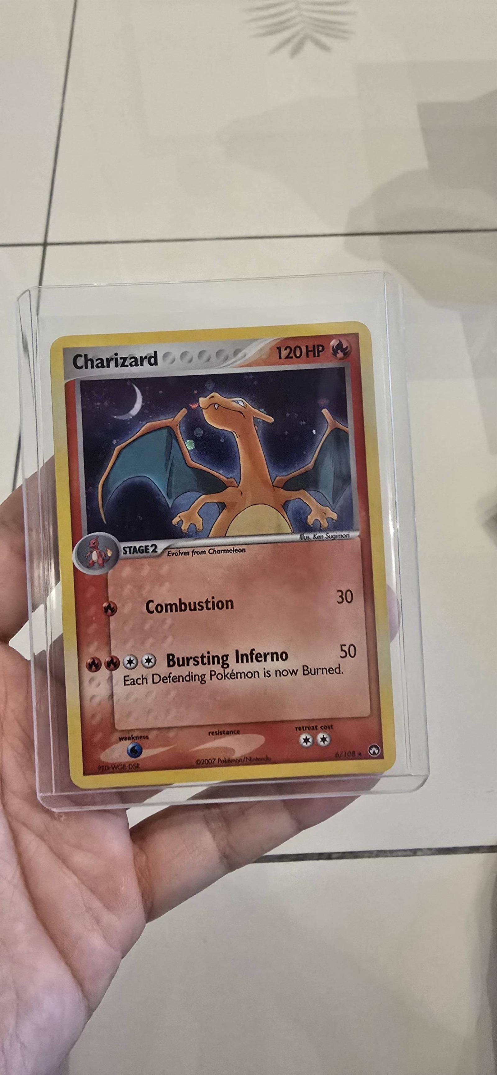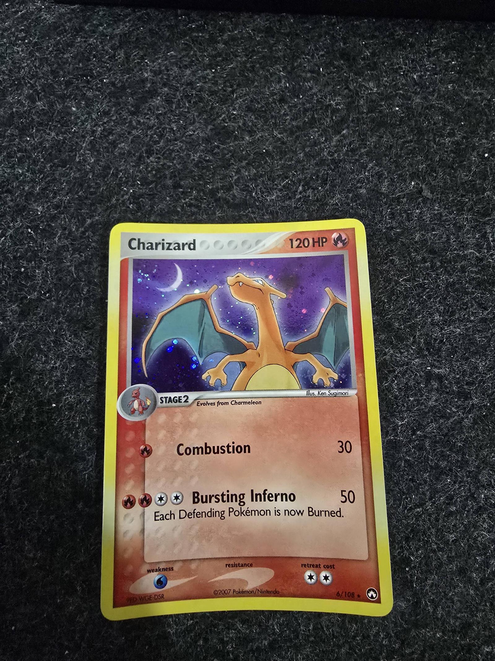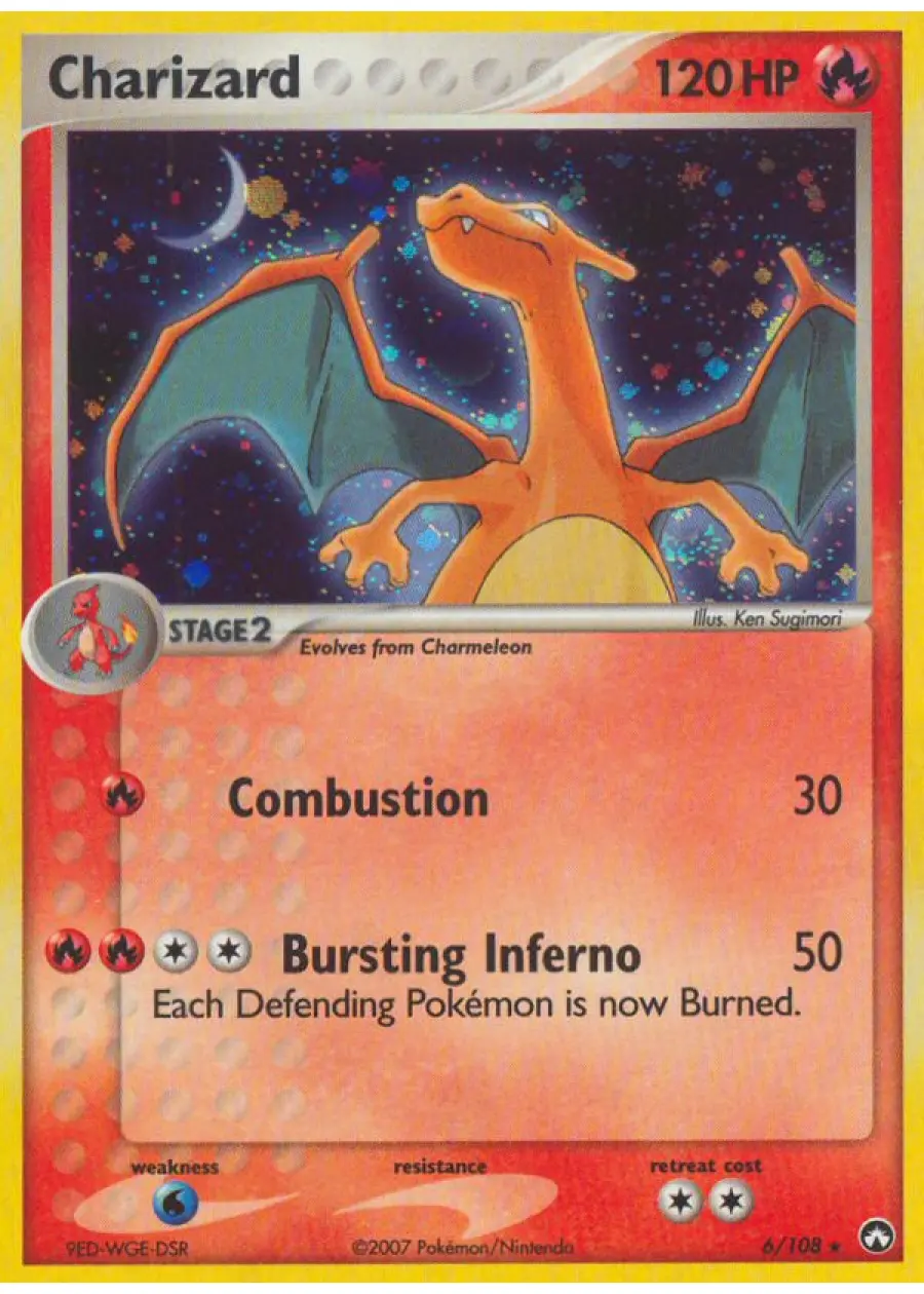 Charizard holo rare card (#6/108) from the EX Dragon Frontiers set, illustrated by Ken Sugimori, released in 2007. This card features the attacks Combustion and Bursting Inferno, the latter burning the defending Pokémon. It is a playable card in the Pokemon TCG meta and a sought-after collectible. The card is in English and has a holographic finish.