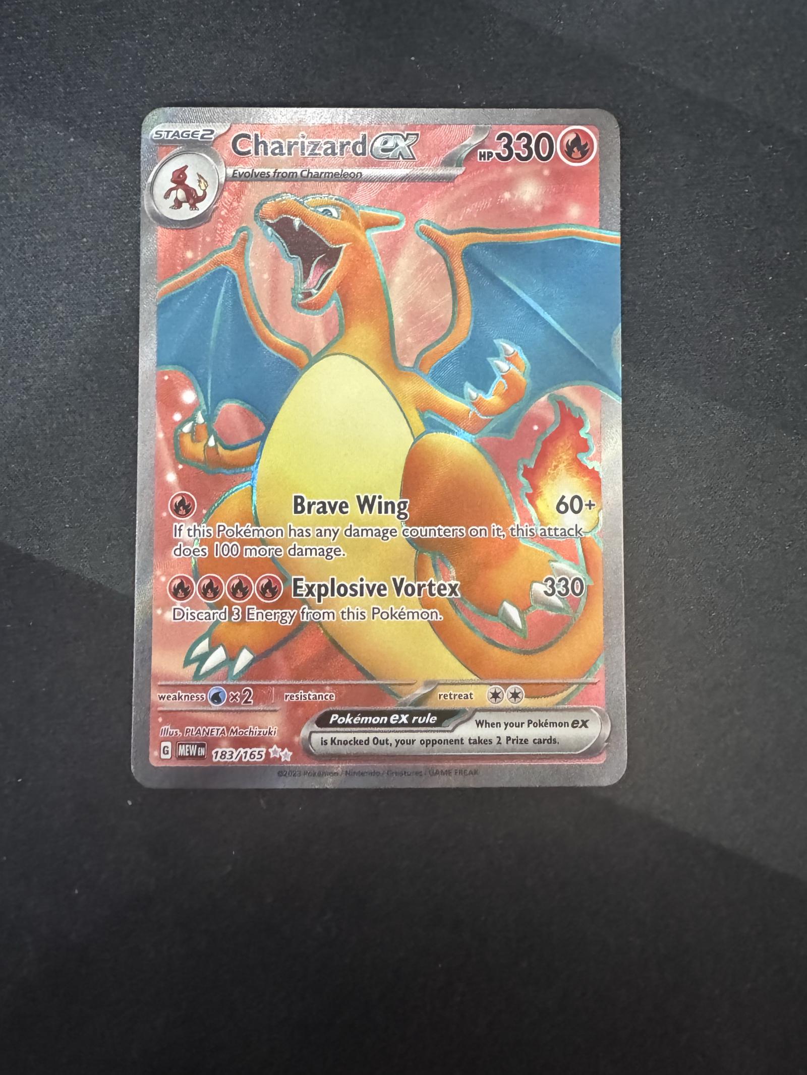 Charizard ex card from the Mew set, card number 183/165. Card code 6X8163 (if visible), illustrated by PLANETA Mochizuki. This is a holofoil card in English language. It is a collectible and playable card in the Pokemon TCG meta. Features powerful attacks Brave Wing and Explosive Vortex. The card is a reverse holo rare with a platinum star set symbol.
