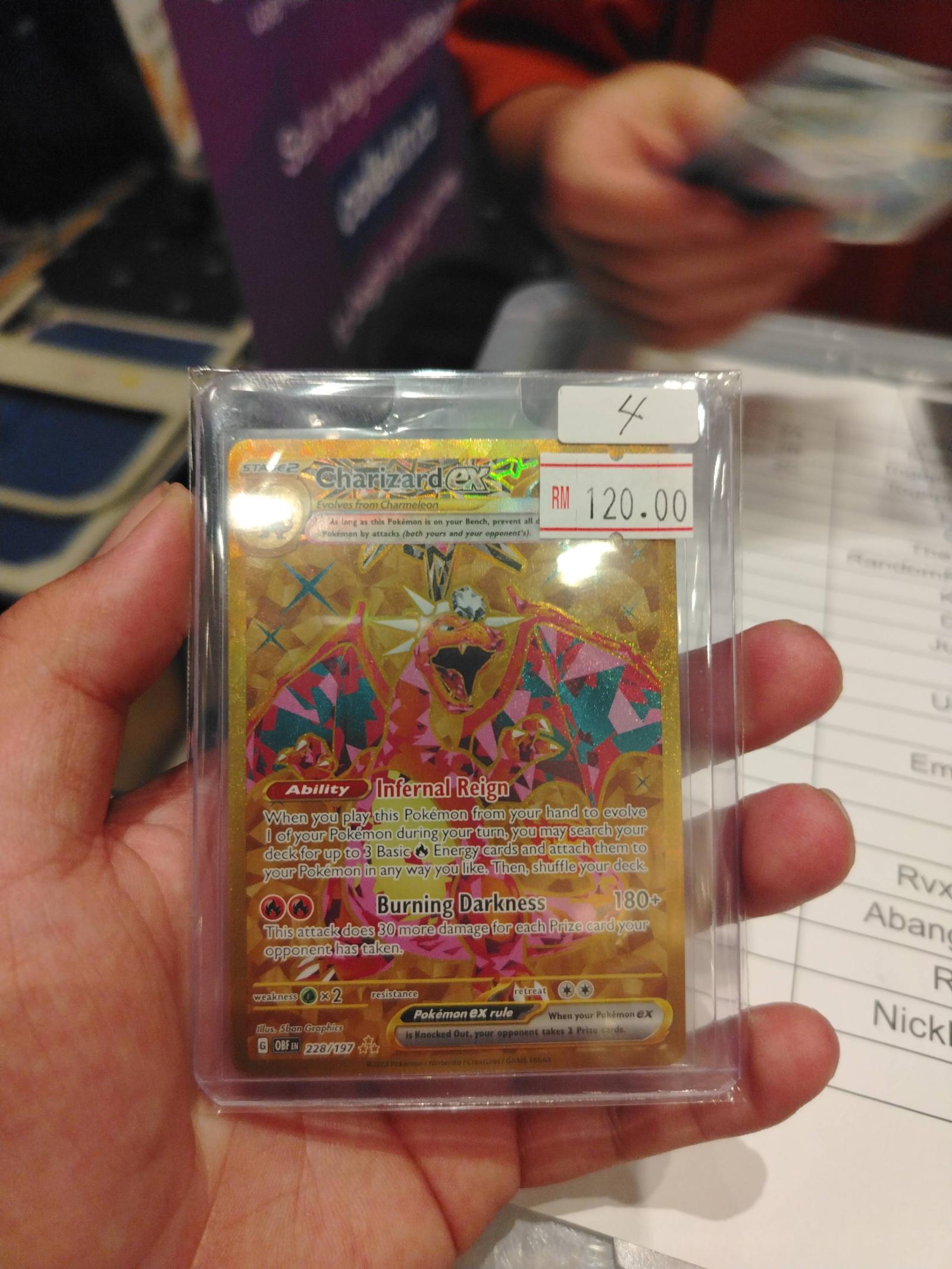 Charizard GX (card code 228/197) from the Sun & Moon Lost Thunder set. Illustrated by 5ban Graphics. This is a full art foil card, featuring the powerful Ability 'Infernal Reign' and the attack 'Burning Darkness'. A standout collectible and playable card in the meta. The card is in protective casing and priced at RM 120.00.