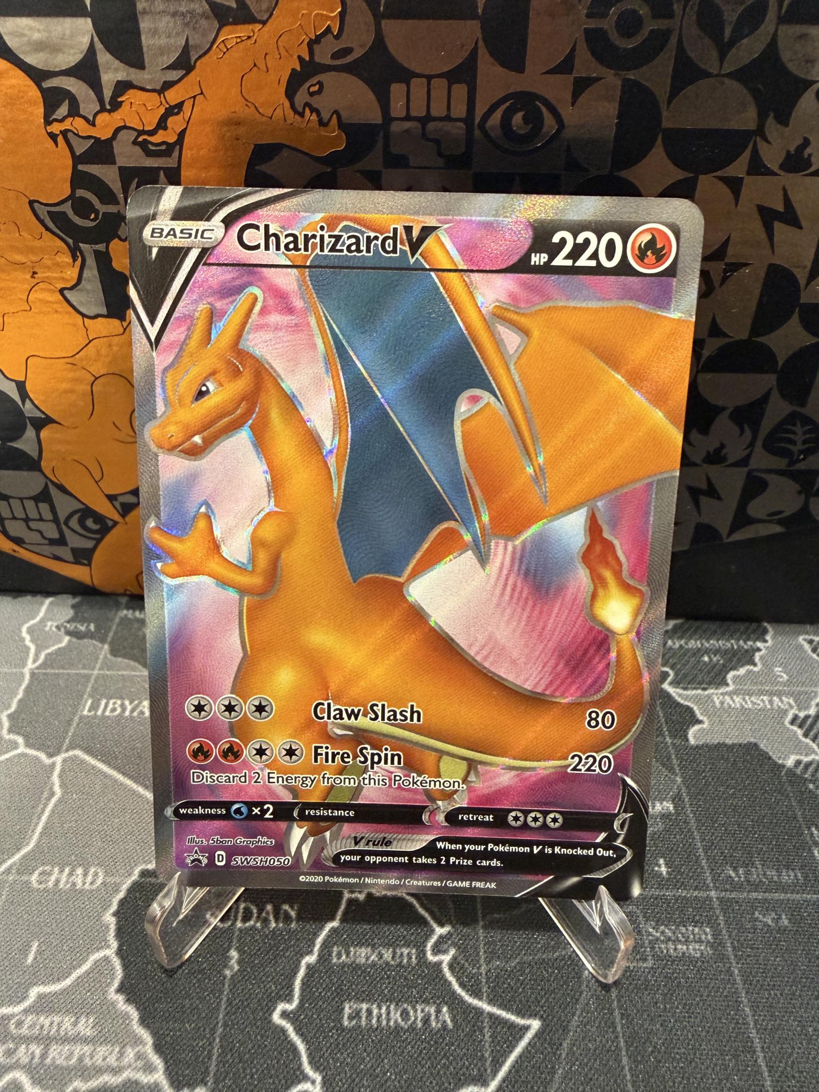 Charizard V from the Sword & Shield Promo set (SWSH050), illustrated by 5ban Graphics. This is a holo rare card numbered 50/189. Featuring 220 HP and strong attacks Claw Slash and Fire Spin, this collectible and playable card is a popular choice among Pokemon TCG players and collectors.