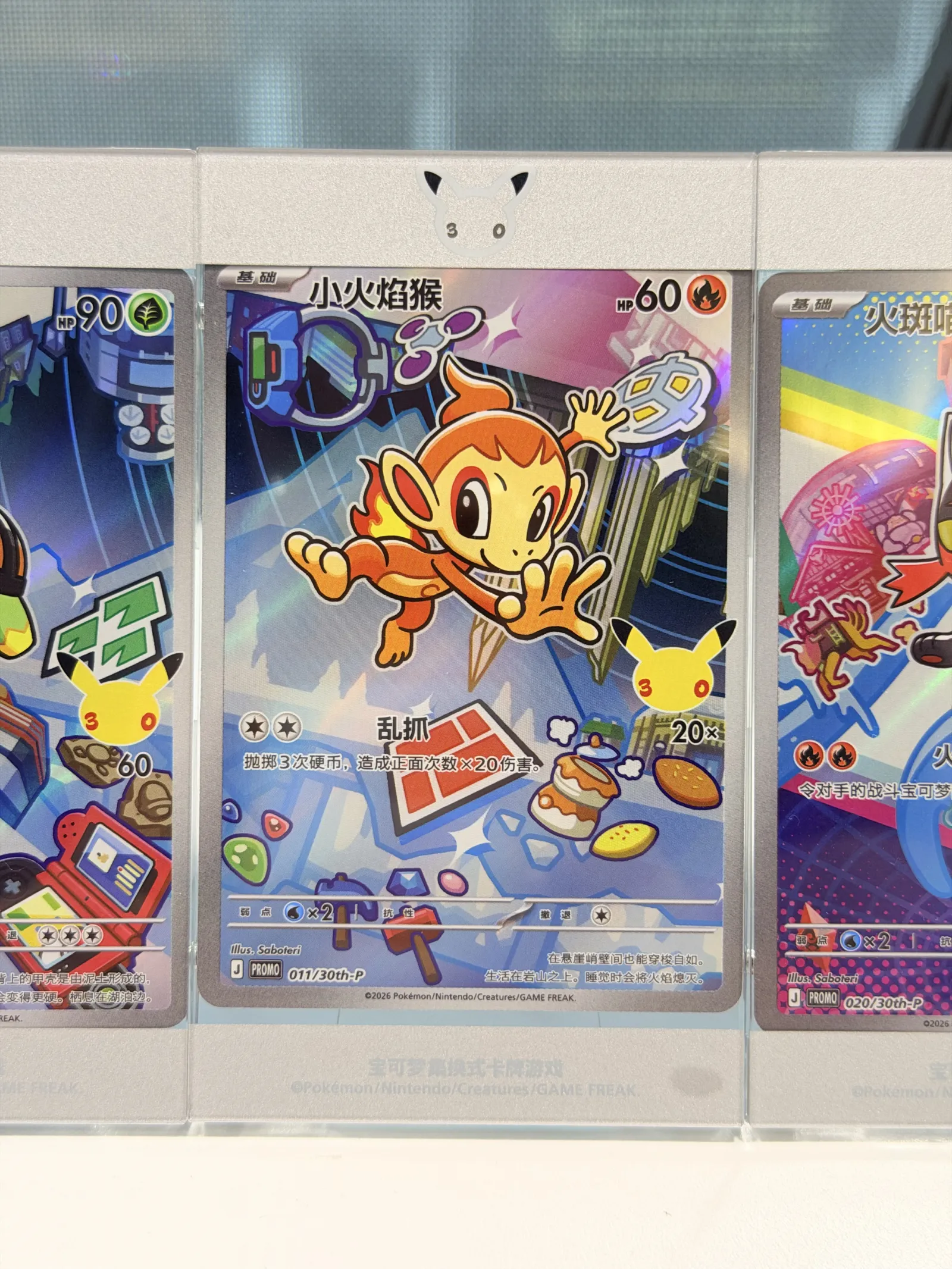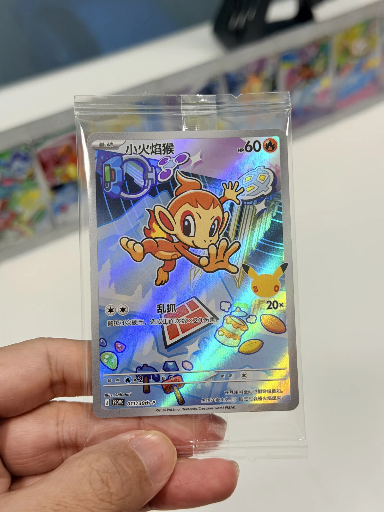 ✨ About the card: • From First Partner Illustration Collection Series 1 (2026) • Features Chimchar, the Sinnoh Fire-type starter 🐒🔥 • Stunning rainbow holo finish with dynamic, game-inspired collage artwork • Includes Pikachu 30th Anniversary stamp • Official Simplified Chinese release (Japan-quality print)