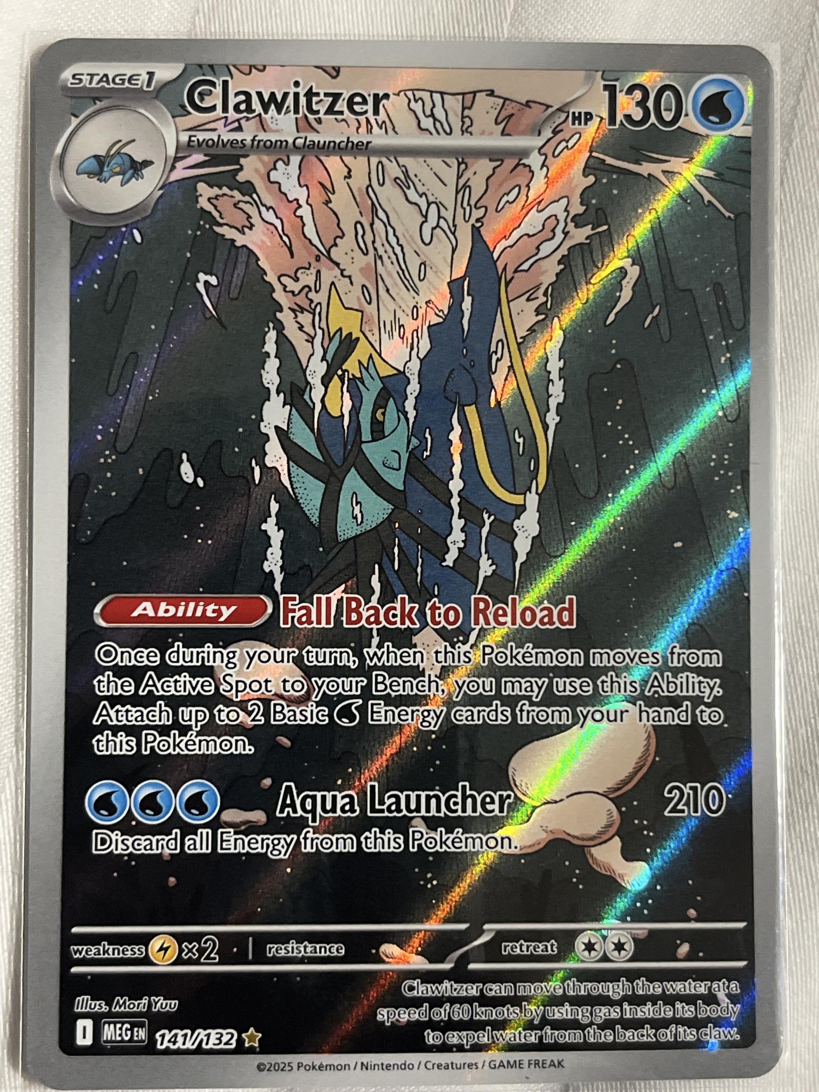 Clawitzer card from the MEGA set, card number 141/132, illustrated by Mori Yuu. This is a full art holo card with the ability 'Fall Back to Reload' and attack 'Aqua Launcher'. Language: English. It is playable in the Pokémon TCG meta and also collectible due to its full art and secret rare foil status.